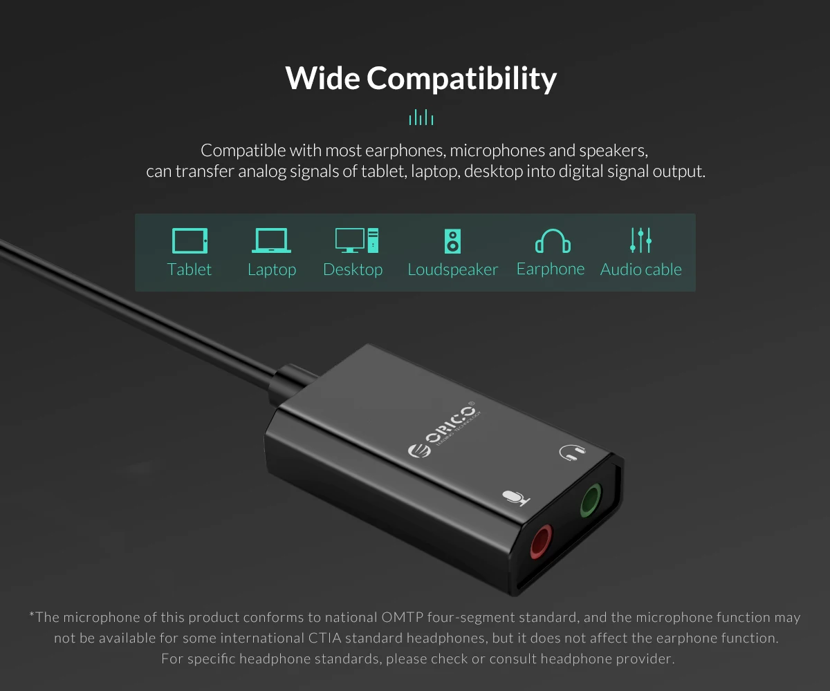 1. Встроенный Звуковая карта адаптер поврежденные или неисправности, замените ее ORICO внешний аудио адаптер Звуковая карта. Он будет работать и рубашки с коротким рукавом в тех случаях, когда вы прослушивания музыки, просмотра фильмов или игр. 2. 3,5 мм разъем для наушников или микрофона интерфейса вашего устройства перестал работать или нет наушников или микрофона интерфейс на вашем устройстве. Он может продлить 3 выхода на вашем устройстве. 3. Внешняя звуковая карта адаптер в тех случаях, когда вам нужно подключить более одного микрофон или наушников на вашем ПК. Вы можете по всему миру получают более высокий уровень звуковые эффекты с помощью этого продукта.