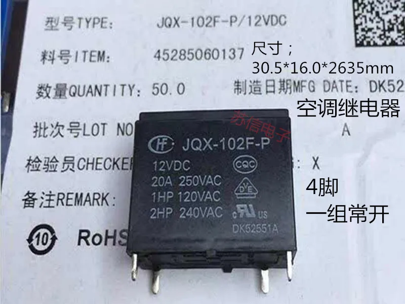 Реле кондиционера JQX-102F-P-12VDC JQX-102F-P JQX-102F 12V HF102F-P-12VDC 20A 250VAC 1HP 120VAC 2HP 240VAC