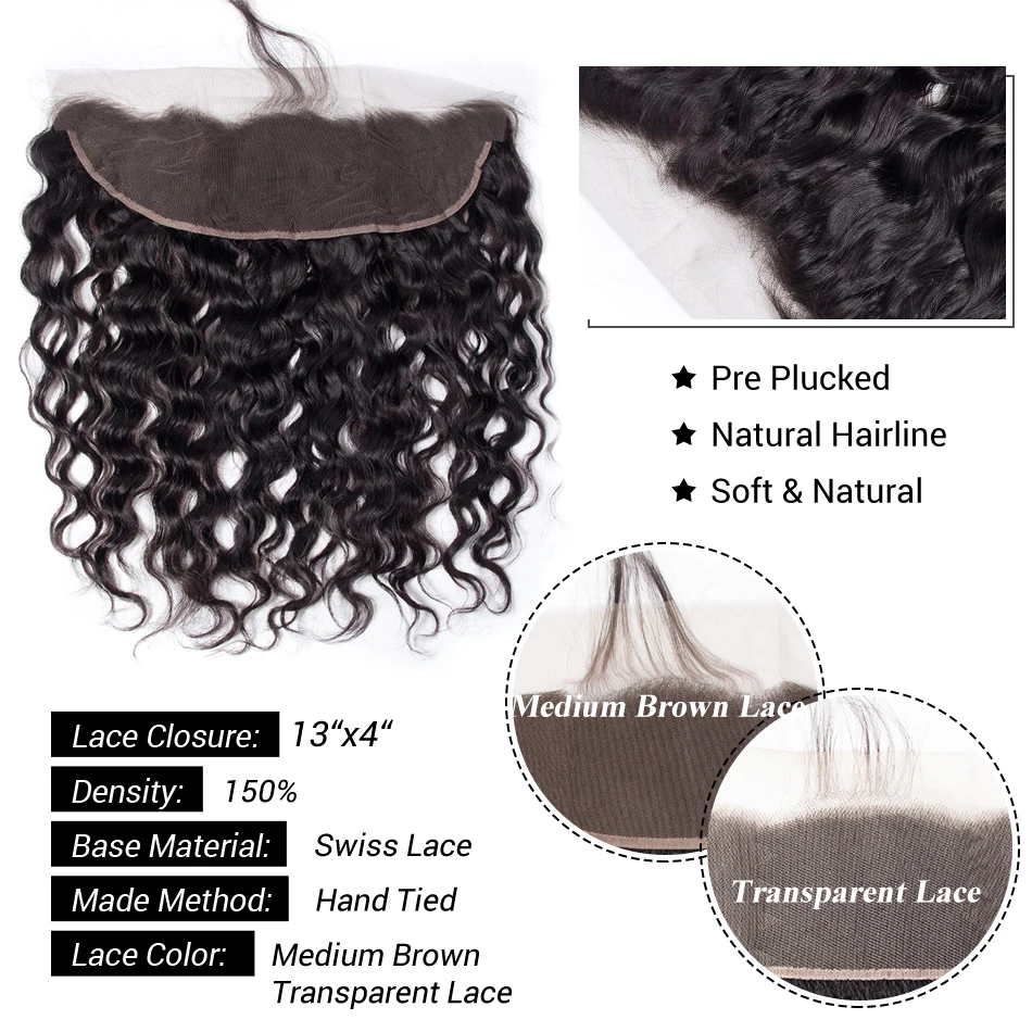 Бразильские волнистые человеческие волосы с кружевным фронтальным закрытием, 3 пряди, с фронтальным закрытием