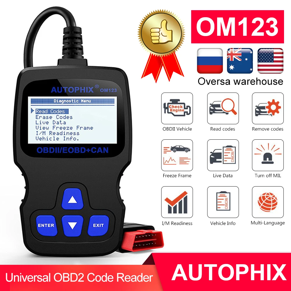 OM123 посылка:1 шт. x OM123 OBD2 считыватель кодов двигателя1 шт. руководство пользователя на Mutil-Language (английский, немецкий, французский, испанский, русский)