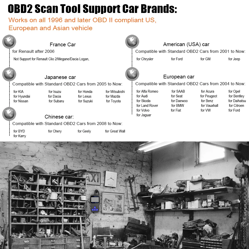 Поддержка 12В дизельный, бензиновый автомобиль.Не поддерживает гибрид, Электромобиль, ВАЗ, УАЗ, LADA, грузовики, пикапы, фургоны.Nissan Lafesta 2008 --- не поддерживает.Если ваш автомобиль японский в 2000-2005, пожалуйста, выберите Специальный японский Автомобильный сканер OM127Американский автомобиль после 2001 года:Для Chrysler, для Ford, для GM, для JeepЕвропейский автомобиль после 2004 года:Для Alfa Romeo, для SAAB, для Acura, для Opel, для Audi, для Seat, для Bentley, для Skoda, для Daewoo, для Benz, для Daihatsu, для Land Rover, для BMW, для Vauxhall, для Volvo, для Fiat, для VW, для Ford, для JaguarДля Skoda Superb после 2006Франция автомобиль после 2006 года:Для Citroen, для PeugeotНе поддерживает RenaultЕсли вы автомобиль Opel,Renault,Citroen,Peugeot до 2004 года, пожалуйста, выберите Специальный Европейский Автомобильный сканер EU410 Азиатский (японский/Корейский) автомобиль после 2005 года: Для KIA, для Isuzu, для Honda, для Mitsubishi, для Hyundai, для Dacia, для Lexus, для Mazda, для Subaru, для ToyotaДля Nissan after 2008Для Suzuki after 2012Не поддерживает SsangyongЕсли ваш автомобиль в 2000-2005, пожалуйста, выберите Специальный японский Автомобильный сканер OM127Китайский автомобиль после 2008 года:Для BYD, для Chery, для Geely, для Great Wall, для KarryПримечание:Несмотря на то, что он совместим с большинством автомобилей, но различные регионы поддерживают протокол OBD2 транспортного средства в разное время, или некоторые машины имеют специальный дизайн, поэтому он может не совместим с некоторыми автомобилями, которые не поддерживают протокол OBD2. Особенно японский и корейский автомобильный бренд. Пожалуйста, оставьте нам сообщение в формате ниже, мы ответим Вам в течение 6 часов.Например: xx, 2005, 2.0cc, дизель