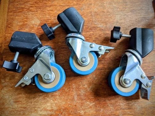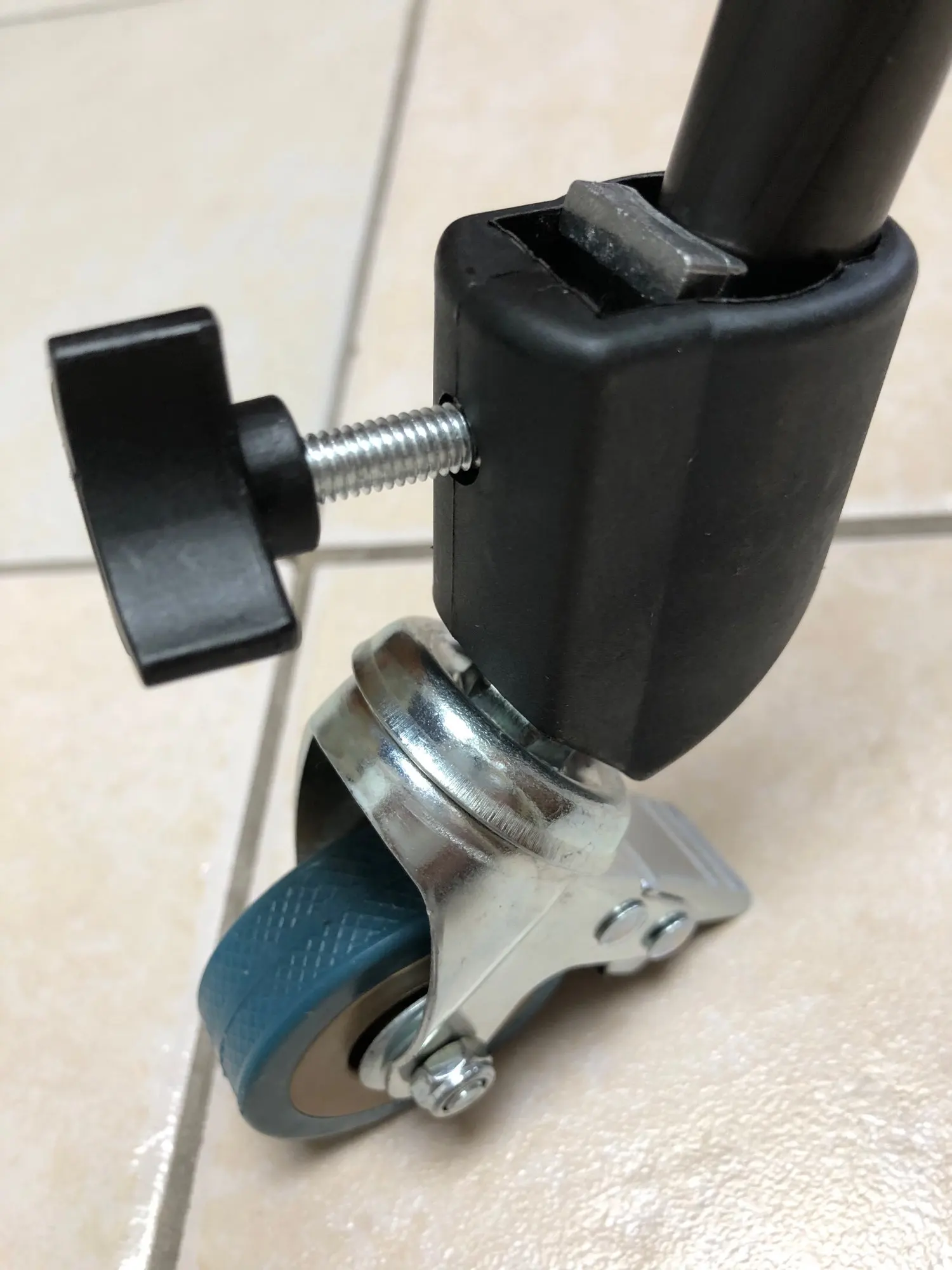 Неплохо за цену. Они кажутся достаточно прочными для дешевой легкой стойки с SL-60 сверху. Ваш расход может отличаться от того, что намного тяжелее. Колеса гладкие на плоских поверхностях (i.e. Лино или деревянный пол), чем над ковром, но так как они предназначены для перемещения оборудования, а не для получения подвижных съемок камеры, они больше, чем до задачи. Самая большая нижняя сторона заключается в том, что колеса в буквенном порядке прикручиваются к креплению (см. Изображение ниже) и будут ослаблены с помощью движения. По этой цене, это не прерыватель сделки для меня, но это означает, что это стоит часто проверять и повторно затягивать, чтобы избежать падения вашего оборудования. Доставка в Великобританию занимает 10 дней.