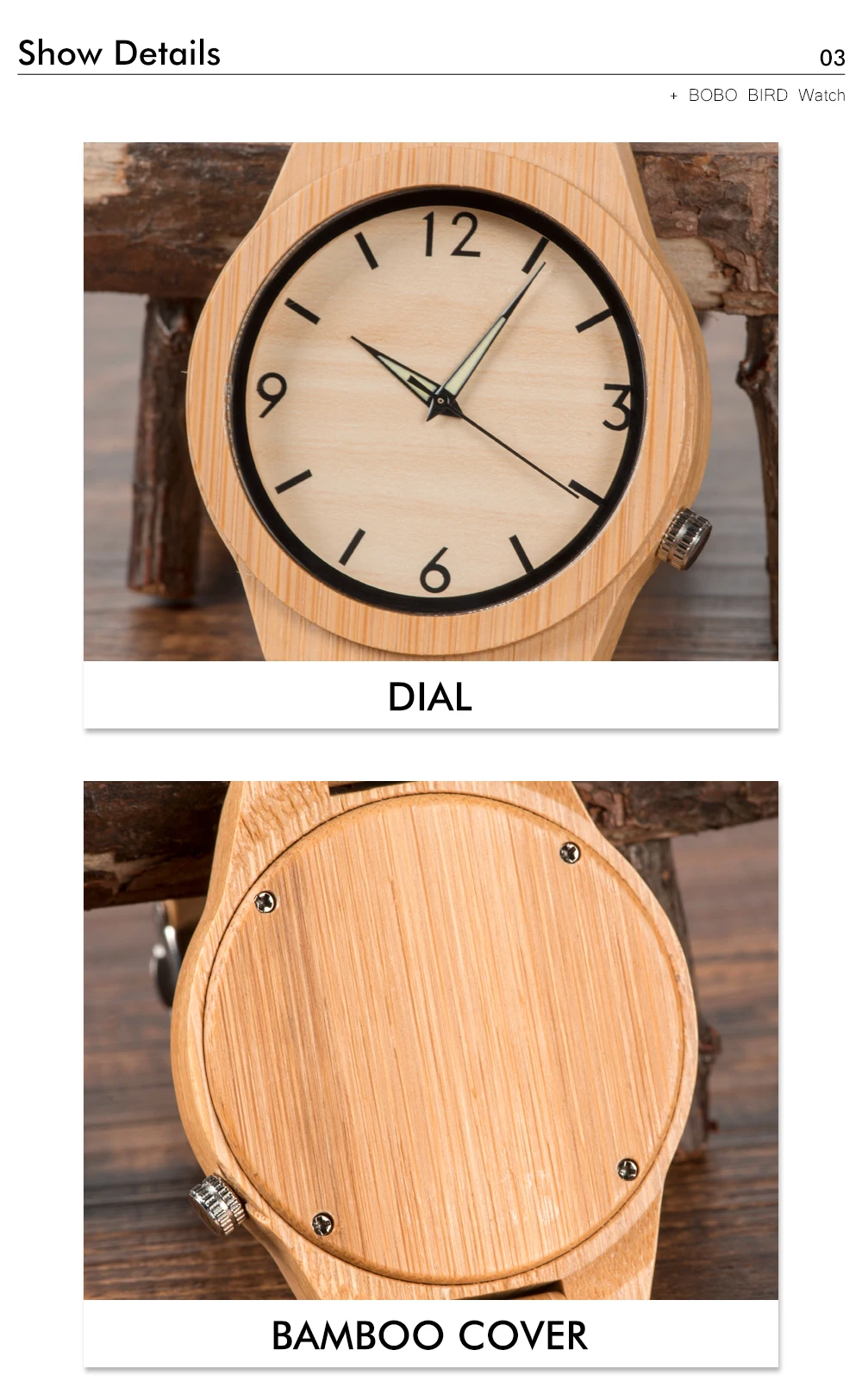 Посылка * 1 бамбуковые часы BOBO BIRD 1 подарочная коробка для бумажных часов Гарантия 1 год Из-за переменного характера бамбука цвет ваших часов может немного отличаться от цвета на фото, что делает ваши часы уникальными. Мы принимаем индивидуальные настройки на циферблате часов, задней панели и коробке, пожалуйста, купите эти часы и логотип вместе.