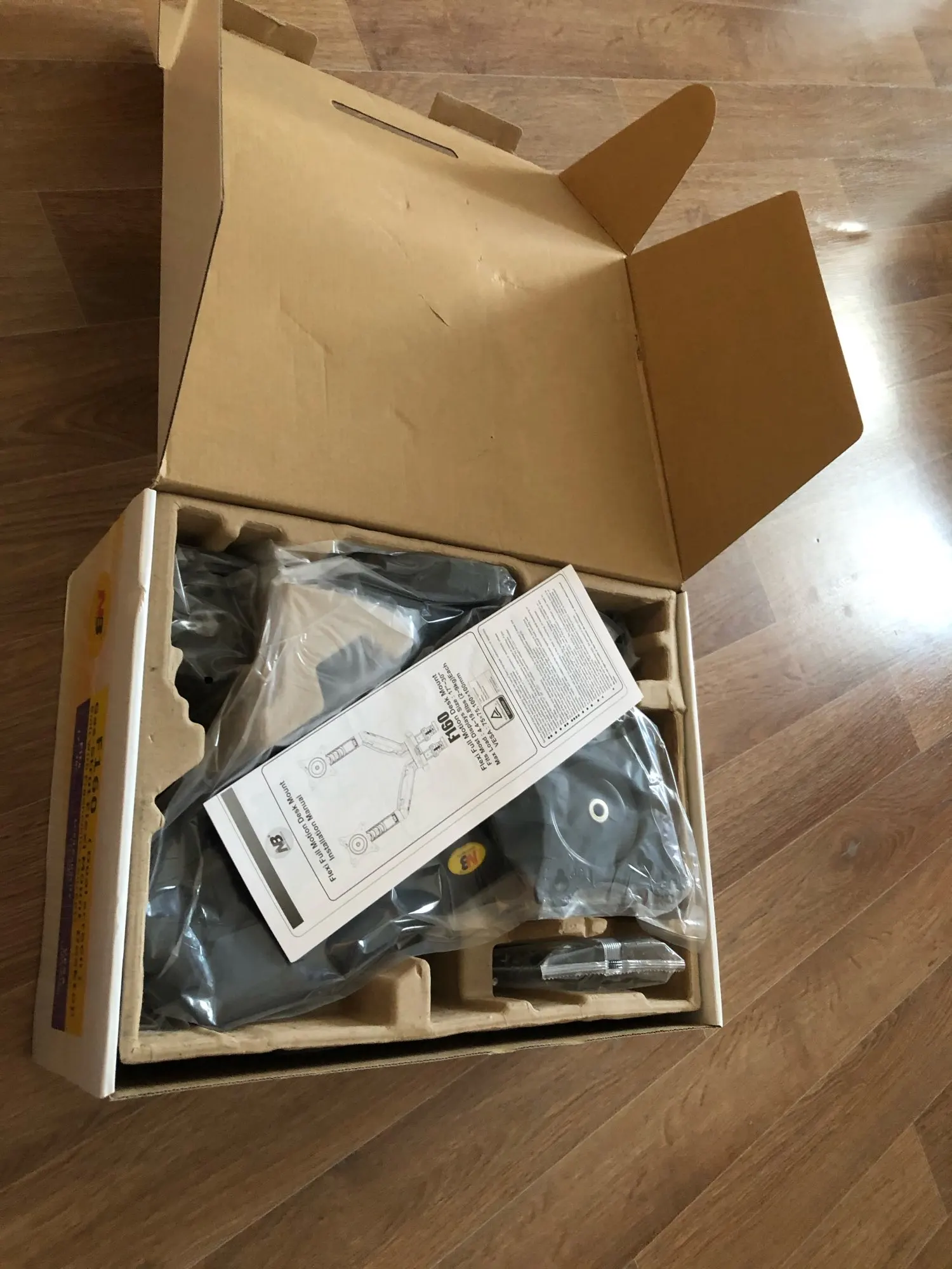 Коробка запечатана, комплектация полная, мониторы 27 дюймов держит уверенно. Наклон монитора в вертикальной плоскости регулировать неудобно - для фиксации нужно затягивать болт. Если понадобится изменить наклон, нужно опять доставать ключ.