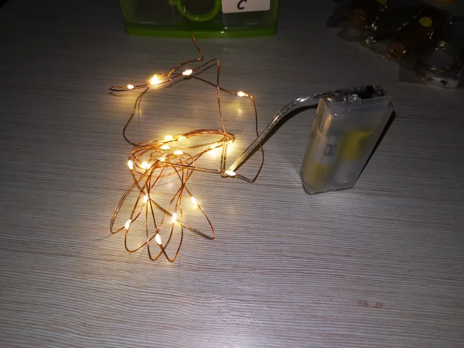доставка быстрая, трек отслеживался) гирлянда хорошая, провод мелкий, жёсткий, можно форму придать любую, держит. очень маленькие лампочки. единственный минус бокс для батареек треснули (((