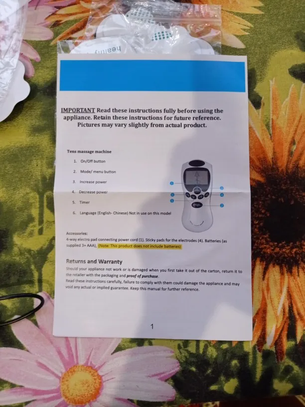 все работает, в тот же вечер устроили массажный салон :) Имеет 15 режимов усиления. можно поставить на 5-10-15 минут. Инструкция на английском языке. Может работать от батареек (мизинчиковые, 3 шт) и от сети.
