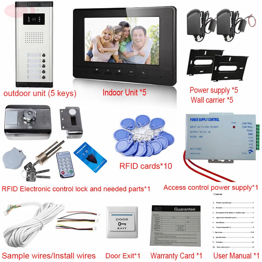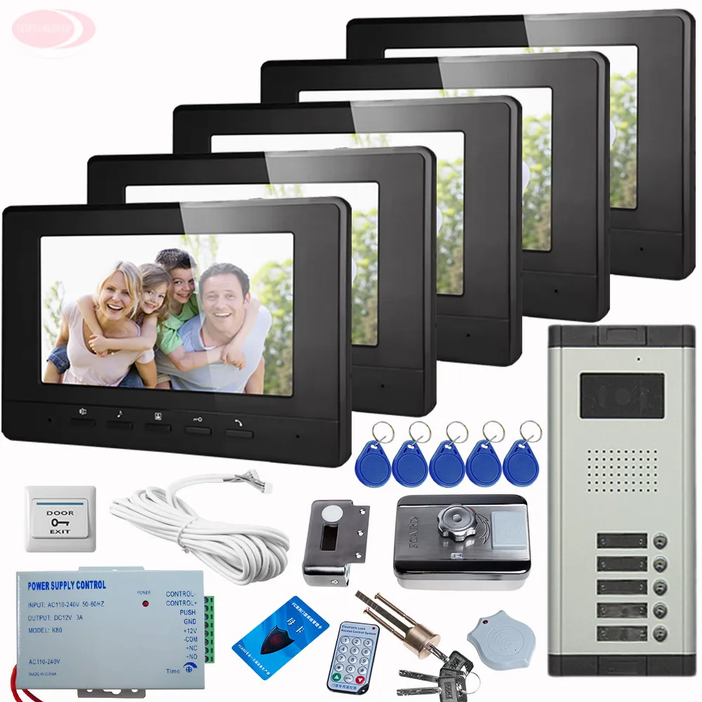 Внешний блок с 5 кнопками + 5 цветными 7-дюймовыми внутренними мониторами + Функция разблокировки Rfid + электронный замок + блок питания с контролем доступа + дверной выход и полный комплект