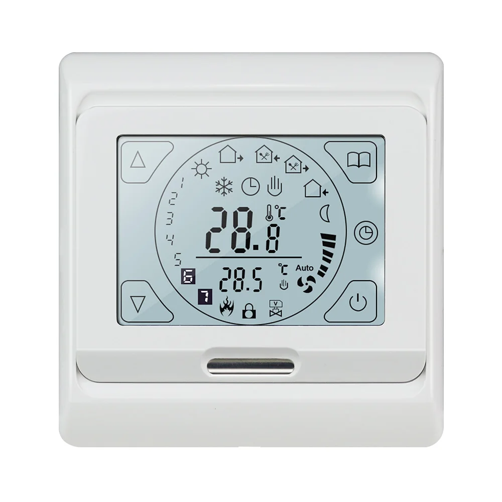Сенсорный экран Программирование периода термостат еженедельная циркуляция, есть возможность установить 6 перидов, называемых событиями каждый день с соответствующей заданной температурой, также вы можете выбрать «режим контроля периода» или «ручной режим» в соответствии с вашими требованиями, Терморегулятор рекомендуется для Управления Электрическими нагревательными приборами или привода клапана включения/выключения, используемого в системе отопления на водной основе.