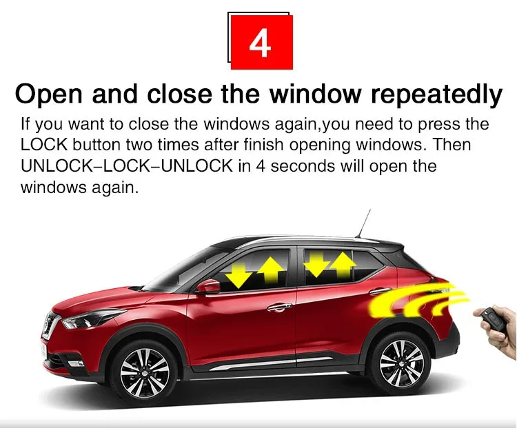 Автомобиль выключен, дверь закрыта, все окна закрыты. Затем подождите 10 секунд, если через 4 секунды Удаленная блокировка-разблокировка, окна будут открыты около 5 см.