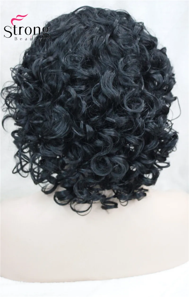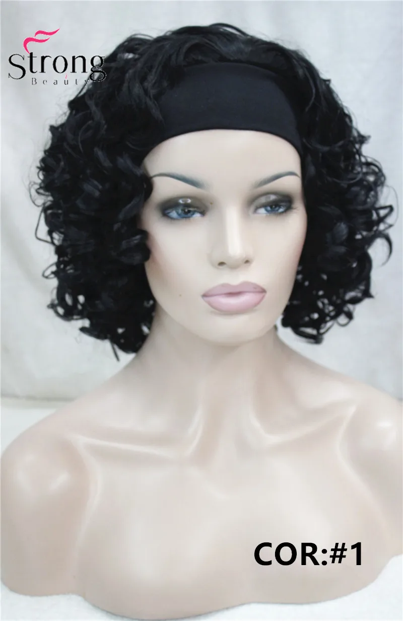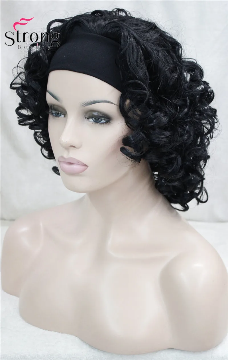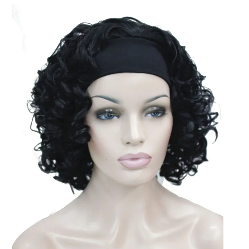 Короткий кудрявый черный синтетический парик с головной повязкой