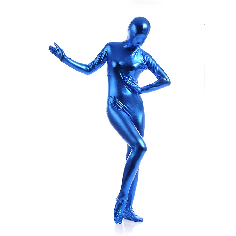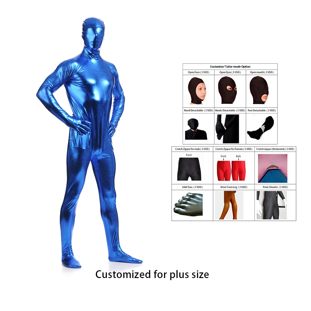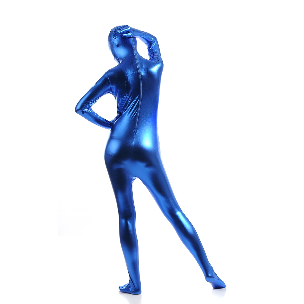 Блестящий лайкра спандекс Блестящий небесно-голубой мужской комбинезон с металлическим подкладом зентай на молнии боди