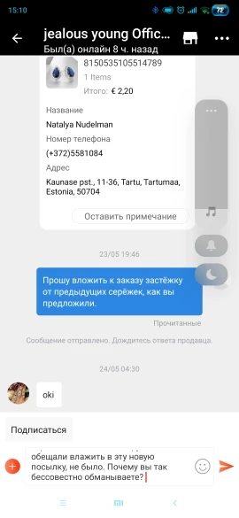Серьги просто прелесть. Выглядят дорого и элегантно. Но... В прошлый раз одну серёжку мне прислали с неправильной застёжкой, которая просто съезжает по серьге как по горке. Продавец сам предложил прислать другую застёжку с новой посылкой. Обещание не выполнено. За постоянные отписки и этот последний обман снижаю оценку общения с продавцом.