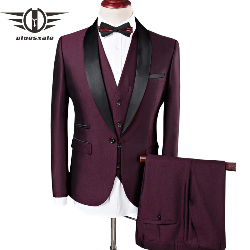 Plyesxale мужской костюм 2021 свадебные костюмы для мужчин воротник шаль 3 штуки приталенный бордовый костюм мужской Королевский синий смокинг куртка Q83