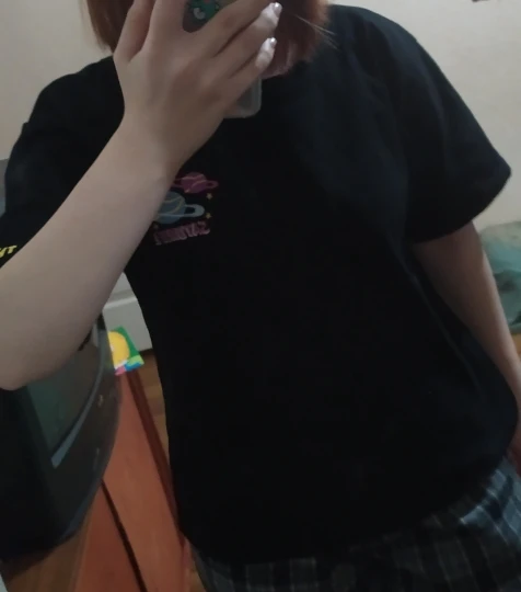 Отличная футболка! На параметры 81/65/91 и рост 154 сидит свободно, но немного коротка по моему мнению (длину видно на фото). Однако я заправляю ее в штаны и это выглядит очень круто. Спереди вышивка, сбоку на рукаве наклейка. Уже стирала, качество не испортилось. Кстати, ткань приятная к телу. Не знаю, почему так мало заказов, я от всей души рекомендую. ~