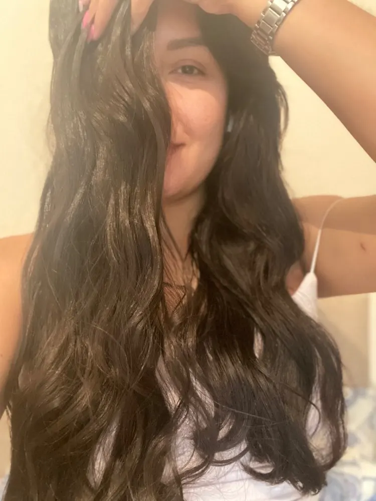 По правде говоря, я очень удивлен качеством и скоростью, я заказал его две недели назад, и он здесь. Волосы не блестят и выглядят естественно! Я рекомендую, что мои волосы-это натуральный темно-коричневый цвет, и они такие же, как те, которые появились.