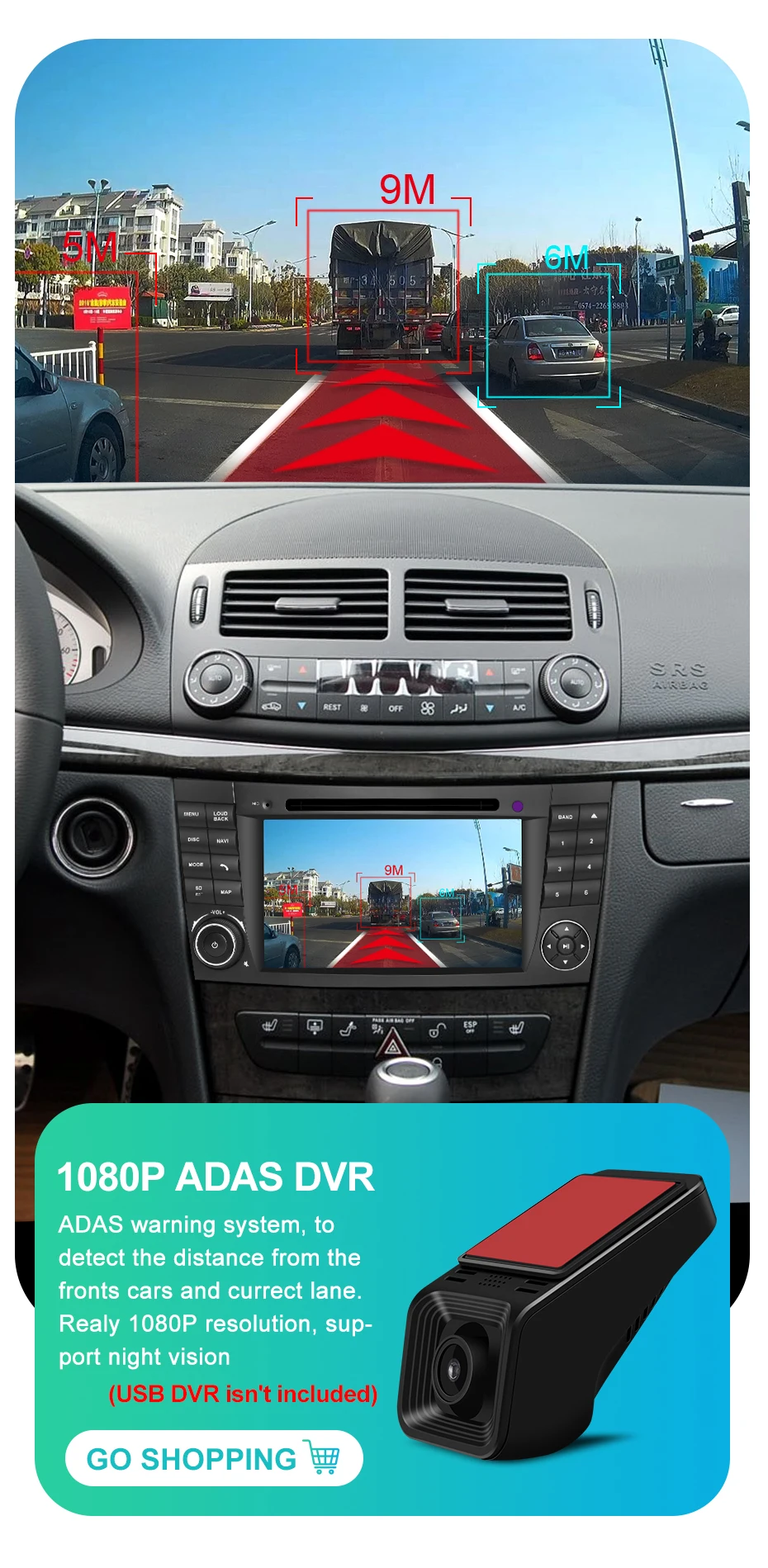 Поддерживает 1080P USB DVR, вам просто нужно подключиться к DVR через USB, не нужно менять кабели, подключи и работай, очень проста в установке.Система ADAS поддерживает предупреждение сзади и предупреждение о выезде с полосы движения.