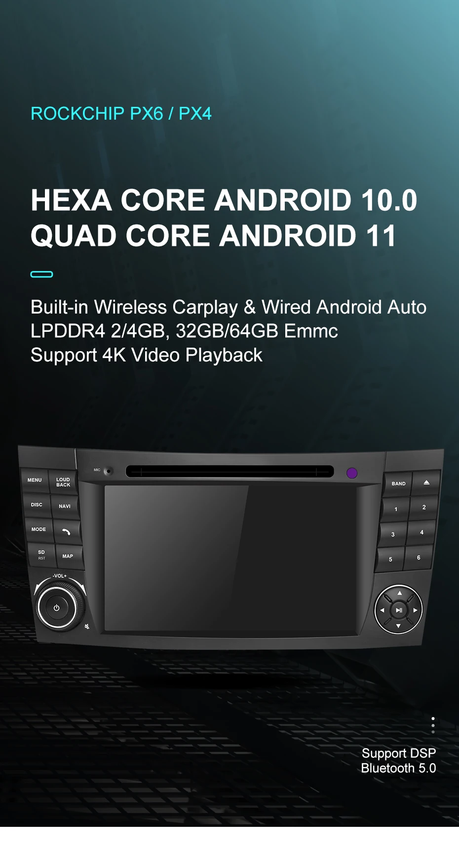 PX6: Rockchip RK3399, шестиядерный, Cortex-A72 * 2 + Cortex-A53 * 4PX4: Rockchip RK3566, четырехъядерный, Cortex A55 * 4Оба они являются высококлассными мультимедийными чипами, с памятью LP-DDR4, скорость отклика очень высокая, работа очень плавная, вам не нужно беспокоиться о зависании из-за установки и запуска слишком большого количества APK.В особенности чип PX4, оснащенный новейшей системой Android 11, нет необходимости беспокоиться о последующем обновлении Android, которое приведет к невозможности установки APK. У него очень хорошее соотношение цены и качества, и это ваш лучший выбор.
