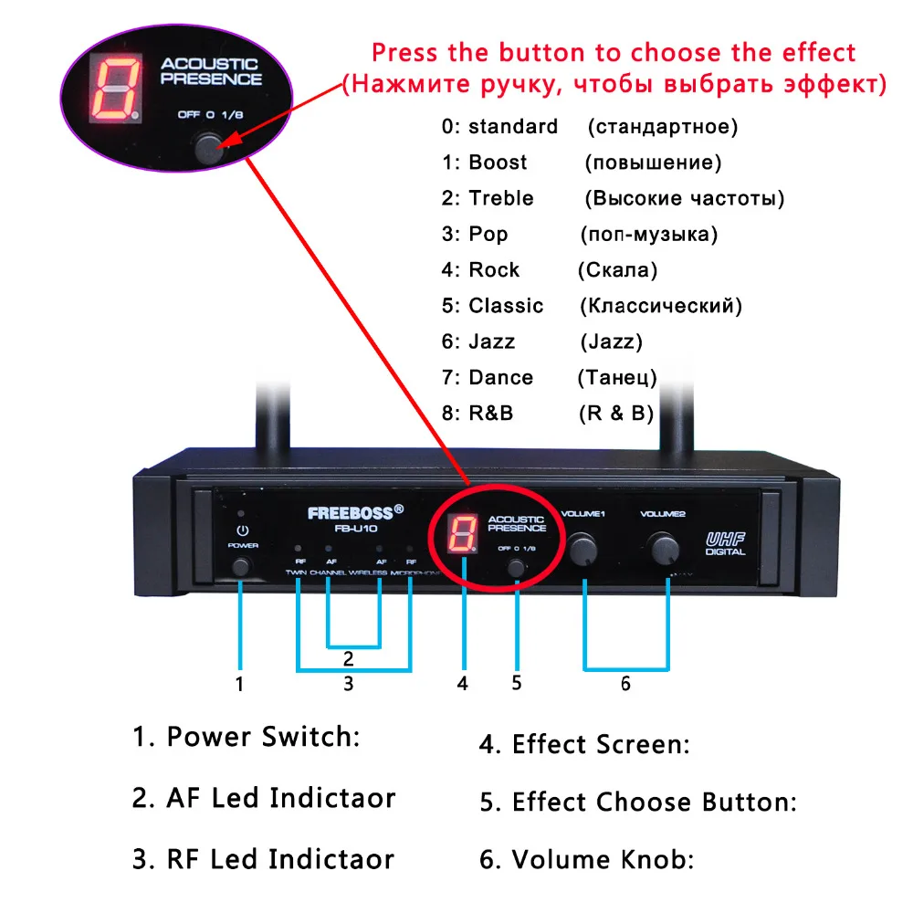 Нажмите кнопку, количество изменится от 0 до 8. Вы можете выбрать эффект в соответствии с номером. (0: стандарт 1: Boost 2: высокие частоты 3: Поп 4: Рок 5: классический 6: джаз 7: Танец 8: R & B)