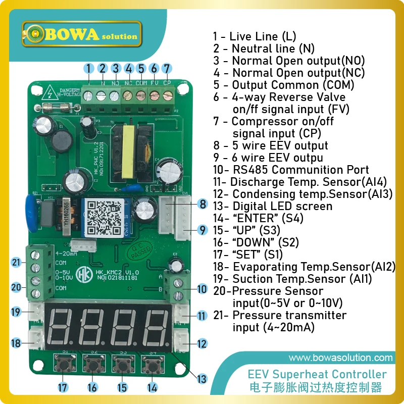 Универсальный и indepedent Электронный расширительный клапан для холодильника контроллер с впрыска жидкости, EVI или эко переключатель, совместимый с 5-проводной или 6 проводов EEV Danfoss, Sporlan, Fujikoki, Эмерсон, Saginomiy , Muller, carel и другие марки EEV. Он обеспечивает идеальные растворы для дросселирования в холодильнике, тепловом насосе и кондиционере.