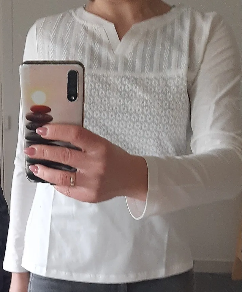 Как описано, как на фото. Теплый белый цвет (как молочный). На рост 160 см рукава и длина топа нормальные, но я бы хотел немного длиннее. В целом мне нравится