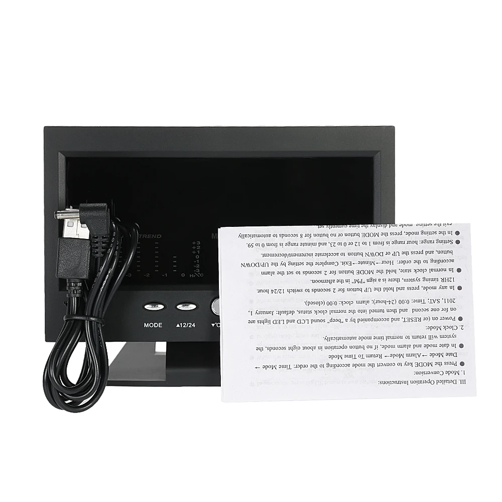 Многофункциональные часы температуры и влажности с функцией прогноза погоды обеспечивают большое удобство для вашей повседневной жизни. С голосовой подсветкой, она энергосберегающая и удобная в использовании. Особенности:Красочный и приятный для глаз дисплей.Измерение температуры и влажности, °C или °F переключается.Запись Макс. & мин. Значение температуры и влажности.Отображение часов, переключение 12/24 часов.Показать вам время, дату, месяц и неделю, и вы можете установить время, дату, месяц, год самостоятельно.С будильником, функцией повтора, погодой, уровнем комфорта, индикацией температуры, действительно практичным.Голосовая подсветка, энергосберегающая и удобная в использовании. Вы можете выключить функцию голосового управления через переключатель на задней части продукта.С кронштейном, его можно разместить на столе.С подвесным отверстием его также можно повесить на стену.Питание от 2 батарей AAA 1,5 В (не входят в комплект).Поставляется с usb-кабелем. При зарядке через usb-кабель подсветка обычно включена. Характеристики:Материал: АБС-пластикЦвет: черныйДиапазон измерения температуры:-10 ~ 61 °C/14,2-140 °FДиапазон измерения влажности: 20%-99% RHИсточник питания: 2*1,5 В AAA батареи (не входят в комплект)Размер изделия: 14*10,5*5,2 см/5,51*4,13*2,05 дюймаВес изделия: 165 г/5,84 унцийРазмер упаковки: 15*11*3,5 см/5,91*4,33*1,38 дюймаВес упаковки: 222 г/7,84 унций Комплектация:1 * часы температуры и влажности1 * кронштейн1 * USB кабель1 * Руководство пользователя