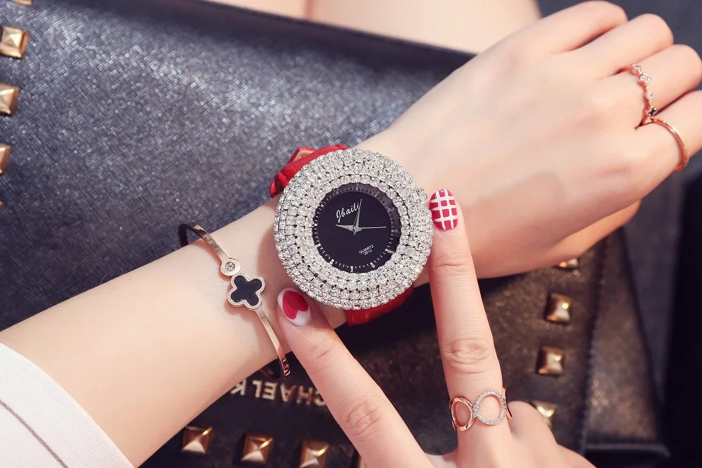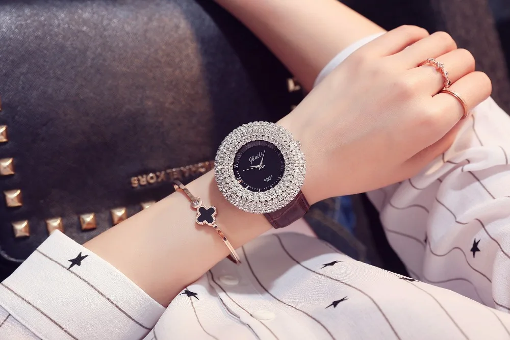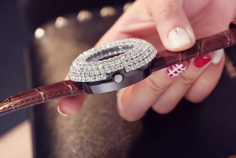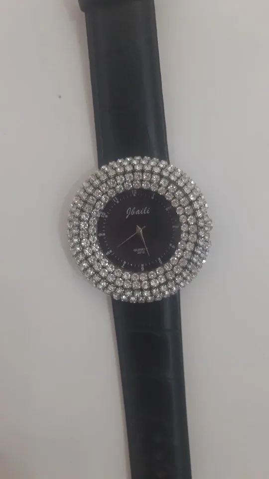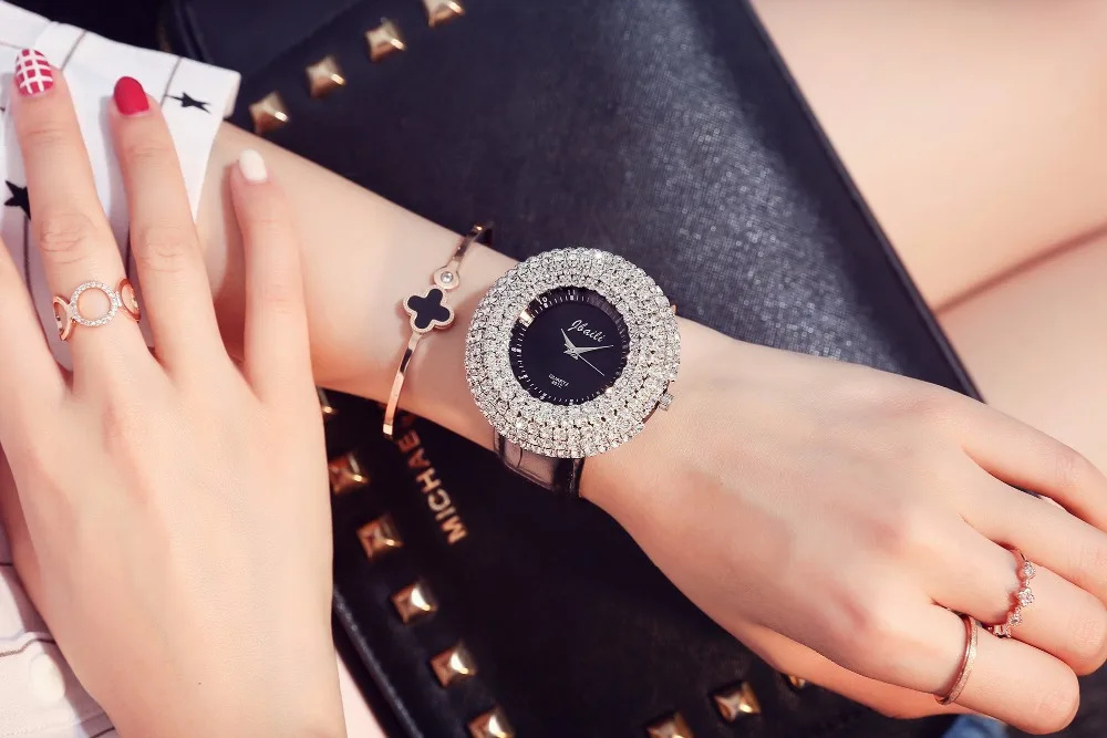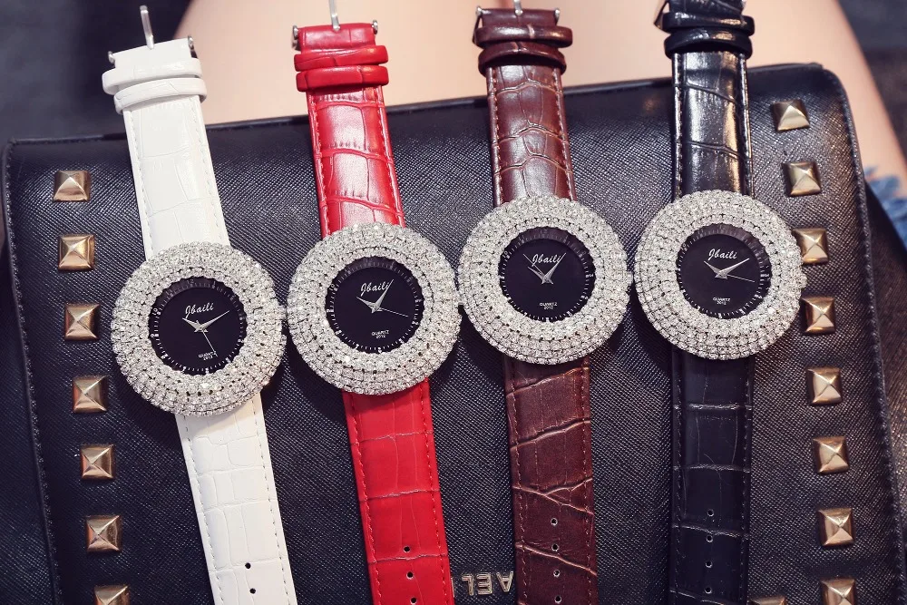 Часы Jbaili кварцевые, с большими стразы, с черным циферблатом, 4 цвета, с кожаным ремешком