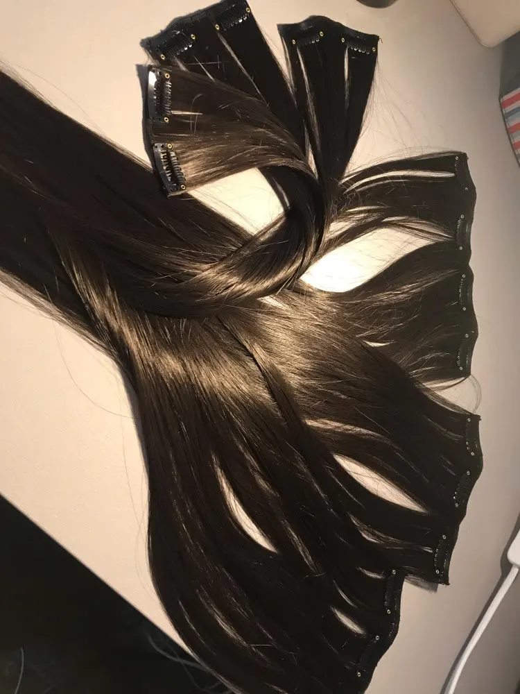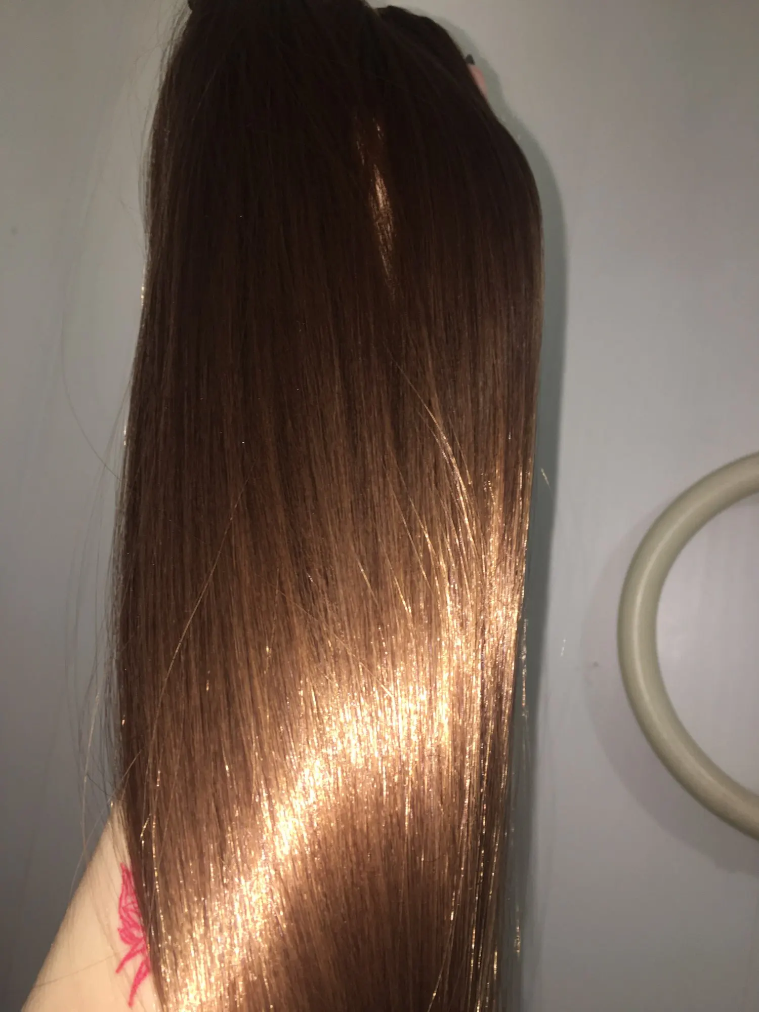 Волосы шикарные, по цвету подошли, ожидала, что будут намного хуже, но результат превзошёл мои ожидания. Крепятся очень легко, выглядят достаточно натурально, на зиму и под шапку вообще супер. Наконец-то я увидела себя с длинными волосами, я ещё никогда такие не отращивала. Блеск есть, но не критично, когда мои волосы после хорошей маски, также блестят, как и эти.
