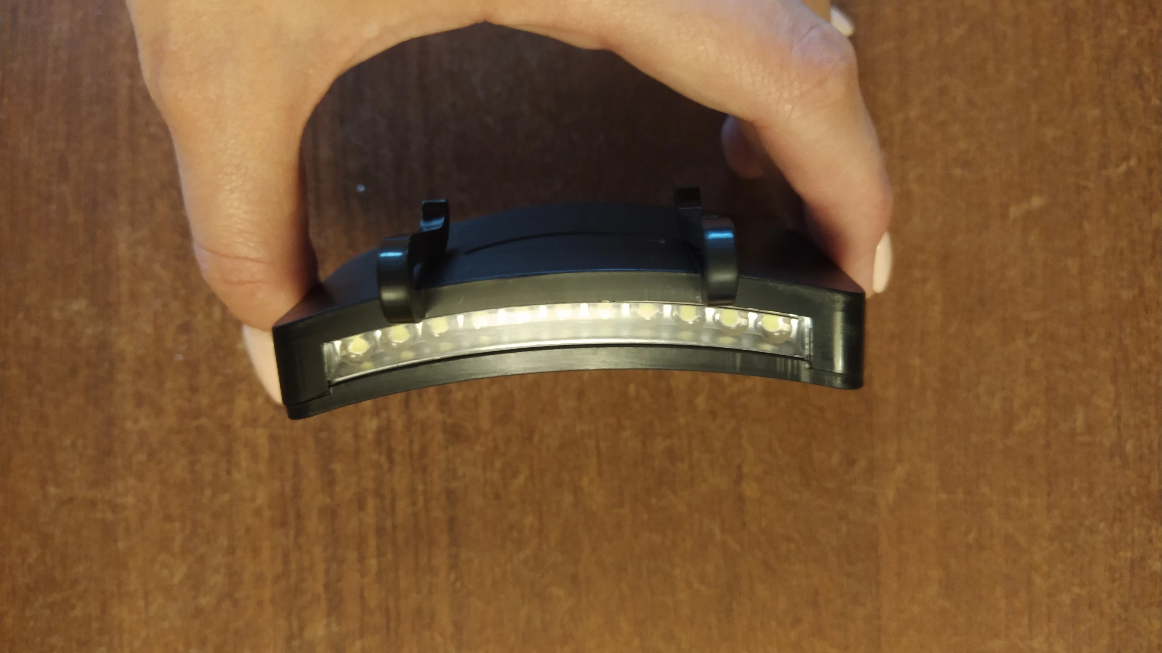 Фонарь светит ярко, на козырьке крепиться плотно, но необходимо соблюдать осторожность, чтобы не сломать зажимы. Было бы лучше, если крепление изготовили из проволочного материала. Крышка фиксируется не плотно, надо дополнительно продумать её защиту от выпадения из корпуса.