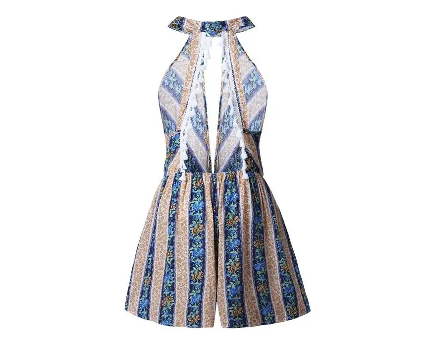Сексуальный комбинезон с рюшами и принтом, женский комбинезон с глубоким v-образным вырезом, с открытой спиной, с кисточками, повседневные открытые летние пляжные комбинезоны