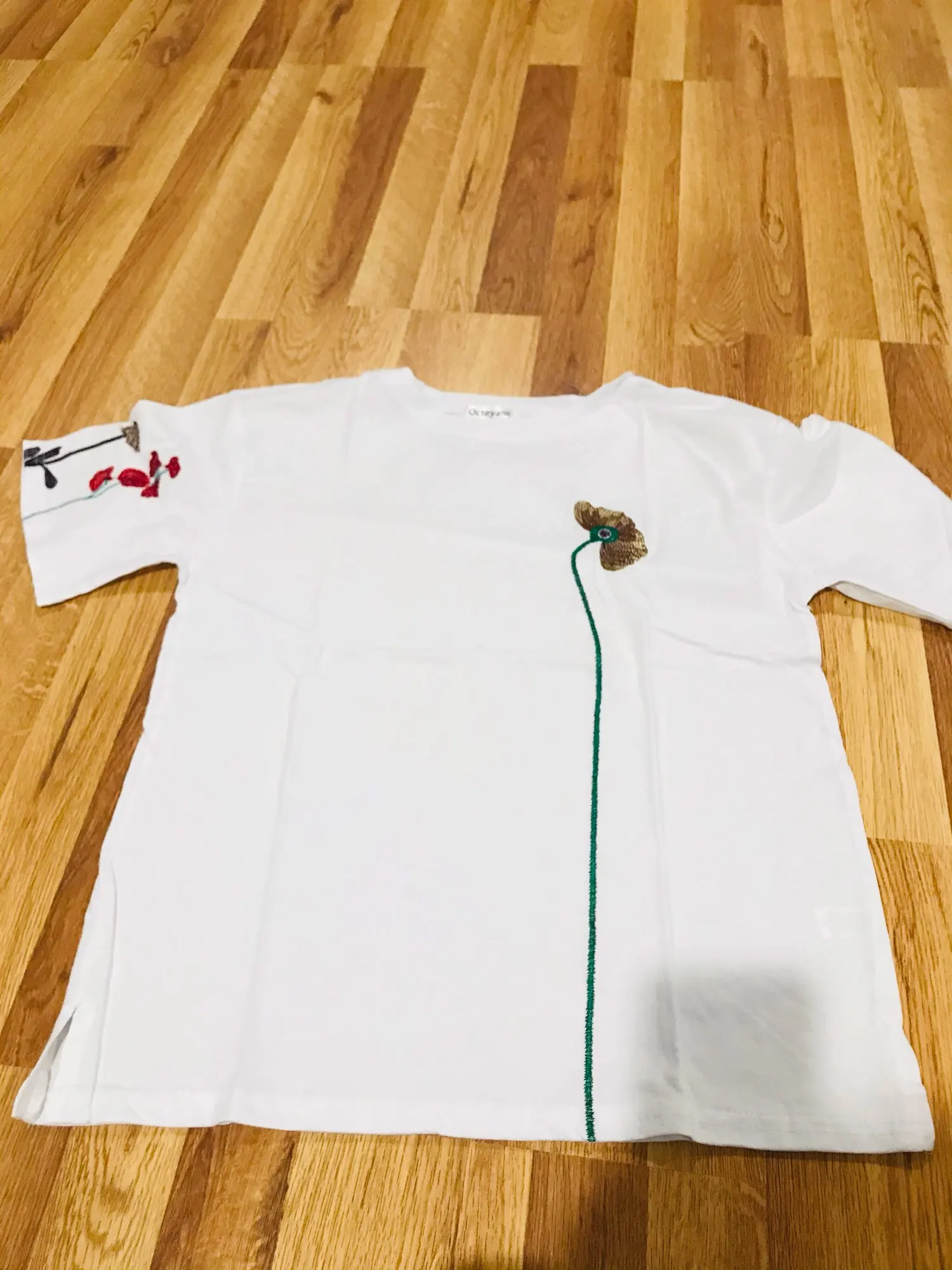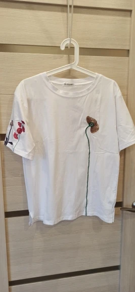 Очень красивая футболка, цвет более насыщенный, чем на фотографиях, но хороший. Отличный хлопок и вышивка. В 95 см обхват груди и размер 1,65 см идеально подходит. Рекомендуемый товар и продавец.