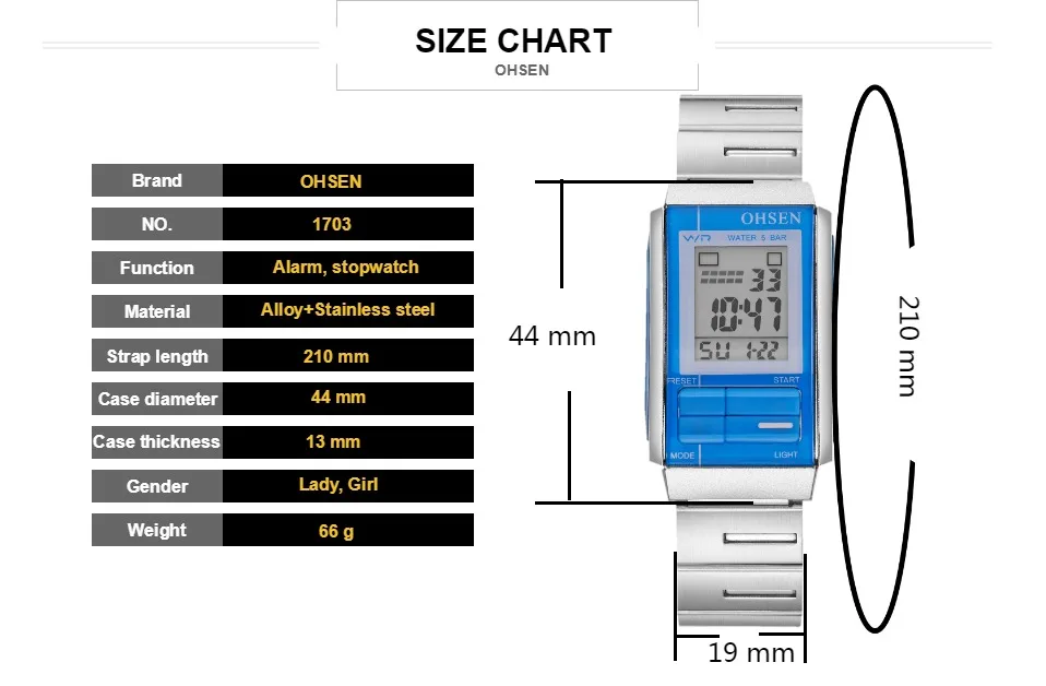 Чехол диаметр: 27 мм * 44 ммЧехол Толщина: 13 ммДлина ремешка: 210 ммШирина ремешка: 19 ммМатериал ремешка: нержавеющая сталь