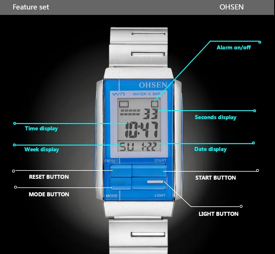 Цифровой: часы, минуты, секунды, вечера, месяц, дата, деньФормат 12/24 часовБудильник и функция ежечасного звонкаСпециальная конструкция с хронограф (секундомер) при температуре не выше 0,01 второй шагВодонепроницаемость до 50 м (не нажимайте кнопку в воде)Дополнительный ЖК-светильник для отображения времени в темноте