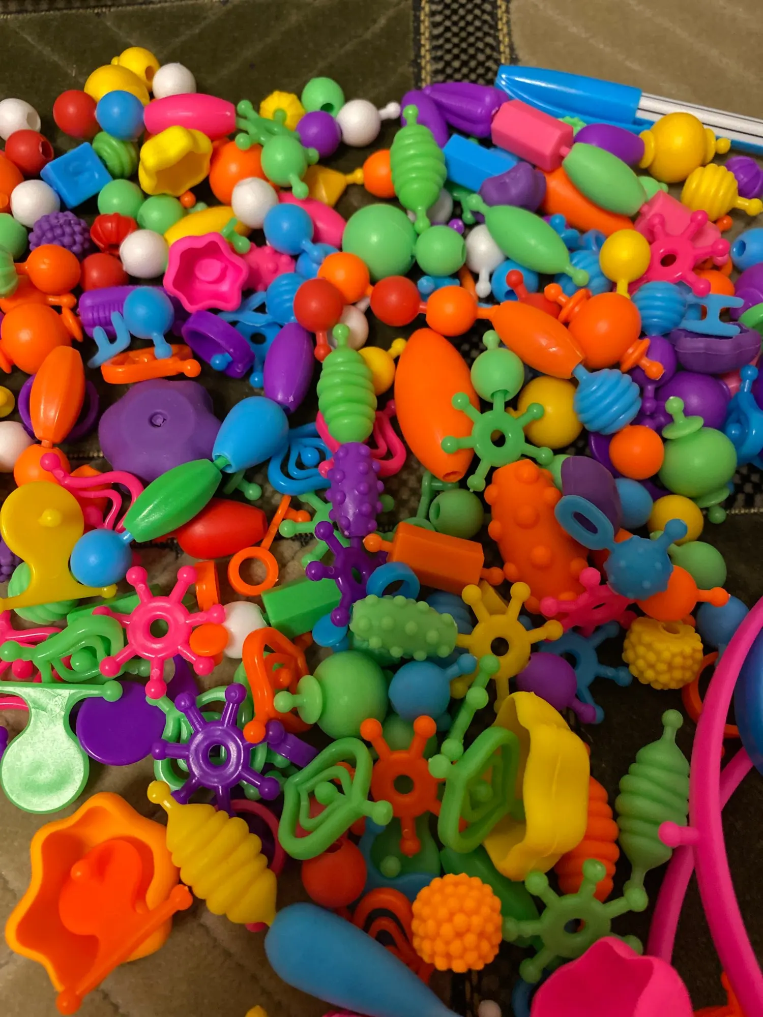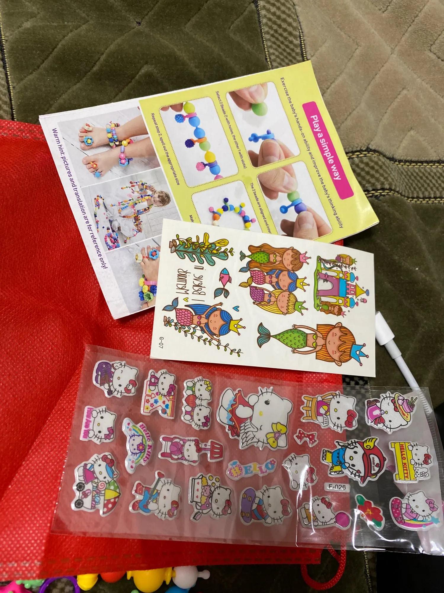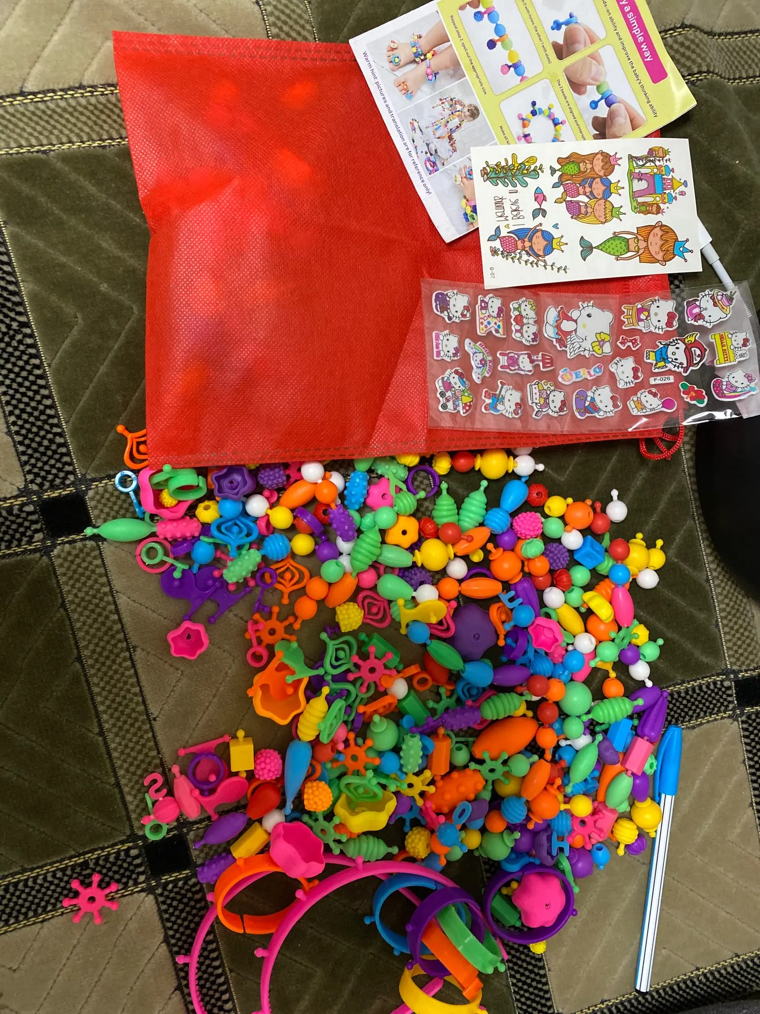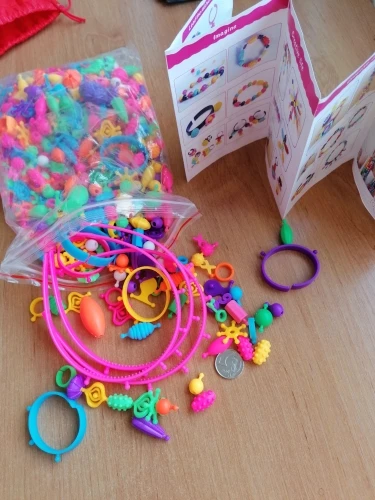 Есть часть элементов в которые нельзя ничего вставить так как очень узкое отверстие( таких штук 15. И очень много соединительных элементов в виде, а хотелось бы больше бусин. А в общем конструктор не плохой, в комплекте есть мешочек для хранения бусин. Продавец положил наклейки и переводи в качестве подарка. С продавцом не общалась.