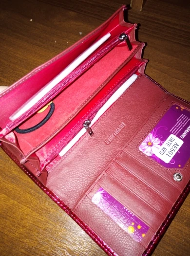 Отличный кошелек. Цвет очень красивый. Заказывала два. Упакованы был очень хорошо и тщательно - бумага, пленка, коробок. В Украину шел Новая почта Международная 25 дней. Купюры помещаются полностью. Единственное, не очень широкий - много карточек не положишь.