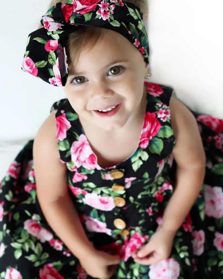 Милый сарафан с цветочным принтом для маленьких девочек, летнее платье + повязка на голову, размер одежды 25 шт.