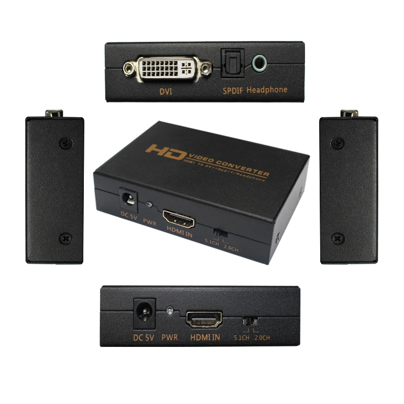 HDMI в DVI + Аудио конвертер может преобразовывать аудио сигнал HDMI от STB, сетевой ящик, ПК и DVD к телевизору, проектору и монитору, который с интерфейсом DVI. Он может помочь пользователям преобразовывать высококачественный HDMI аудио сигнал к нормальному DVI сигналу, так что он может быть широко использован на телевизоре, проекторе и мониторе, который поддерживает DTS/AC3/PCM/LPCM/и т. Д. В то же время.
