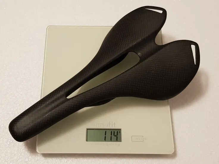 Отличное седло с хорошей отделкой. Вес был 109 г. Я использовал немного более тяжелый вариант с подкладкой (119 г) в течение полутора лет без каких-либо проблем на моем MTB. Получил тот же, но с титановыми рельсами на шоссейном велосипеде, также никаких проблем. Попробую этот голый углерод и посмотрите, как моя задняя сторона с ним согласны;-) 1 небольшое Примечание: рельсы отличаются, и по каким-то причинам мои другие седла. Зажимной рельс короче и отличается по форме, чем другие. Это делает так, что мне нужно было настроить седло на 1,5 см короче, чем мой предыдущий. Нужно проверить, как это работает
