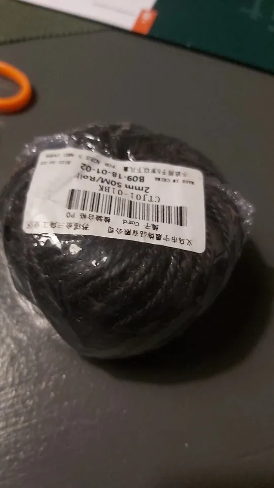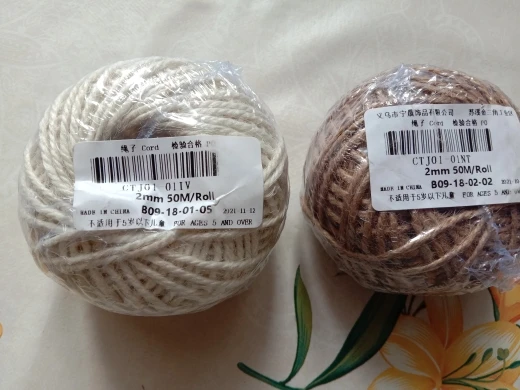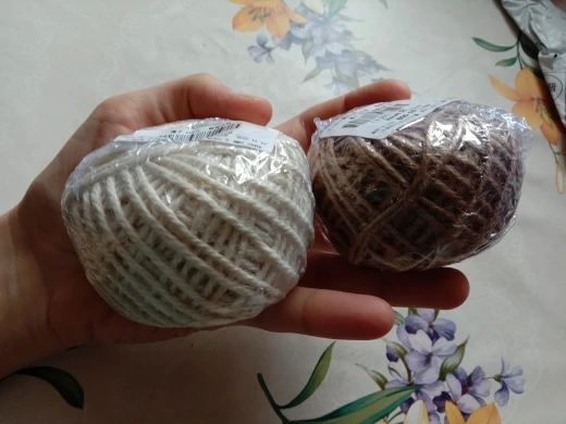 пришло через месяц. хороший жгут. размер правда одинаковый по 50м. но белый моток по объему больше, на фото видно. размер самой веревки соответствует 2 мм. и коричневый жгут темного оттенка. я покупала в магазине на катушке, светлее немного веревка. на фото видно. а так в целом неплохо. продавца и товар рекомендую.