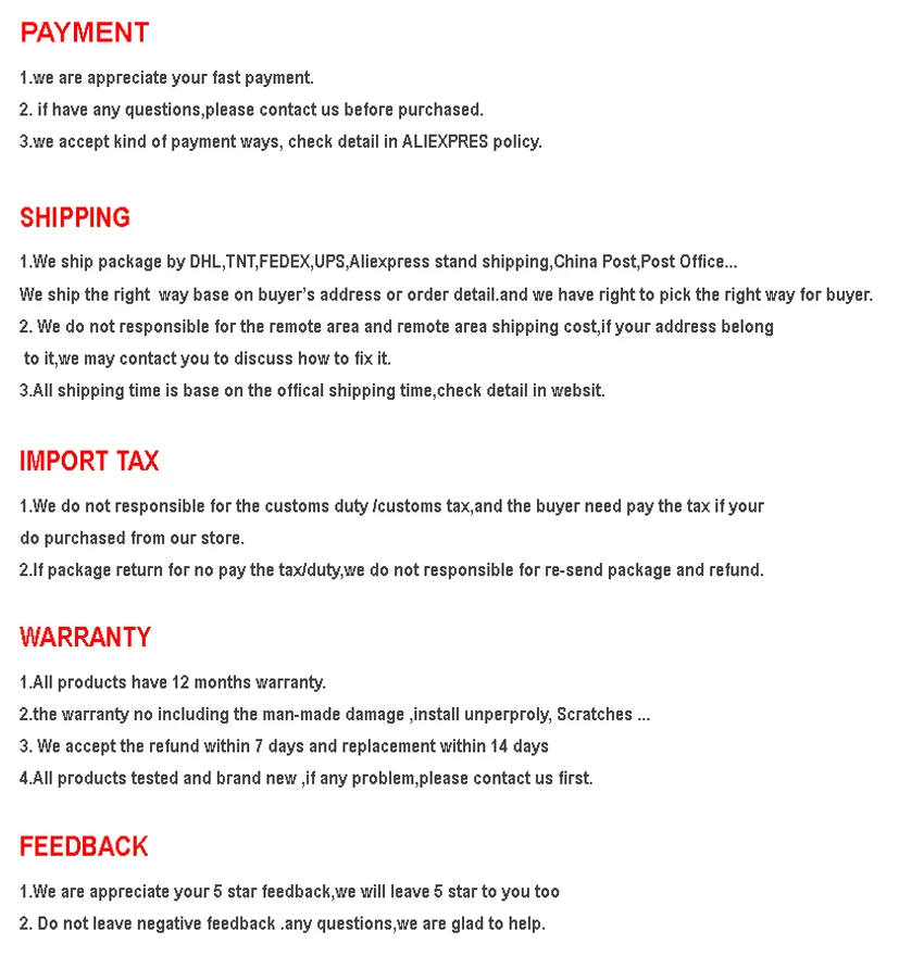 Продавец бежать. Я заплатил дополнительную сумму 25d, чтобы быть доставленной быстрее, и в конце концов мой заказ прибыл в то же время, что и первоначально запланированная доставка. Затем Мой paypal счет, с которым я заплатил за товар. Был сломан. Несколько небольших количеств, взятых через PayPal. И для того, чтобы все исправить, статья прибыла и очень разочарована. Провода одной из коробок даже не были установлены правильно. Жаль, что я должен поставить звезду, потому что она того не стоит