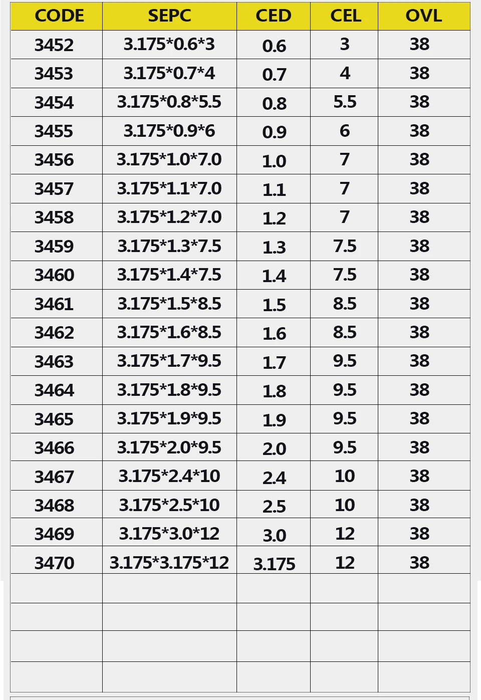 Диаметр хвостовика: 3,175 ммДиаметр режущей кромки: 0,6-3,175 ммОбщая длина: 38 мм