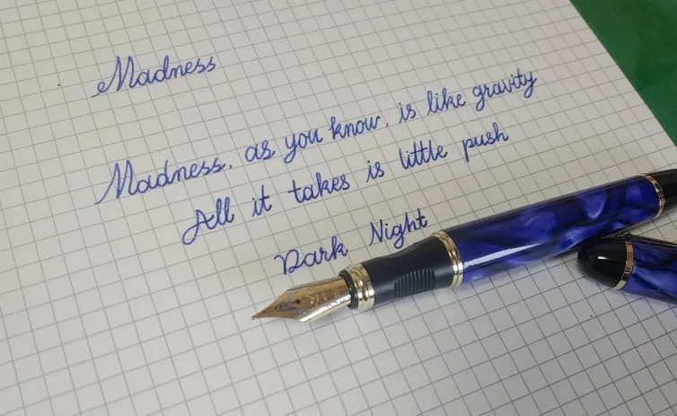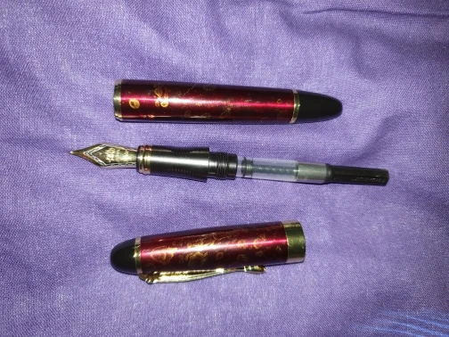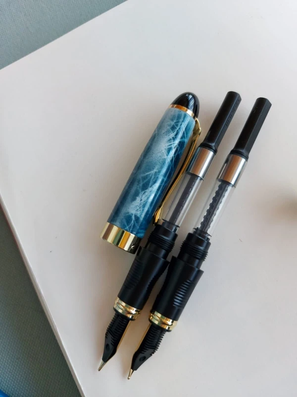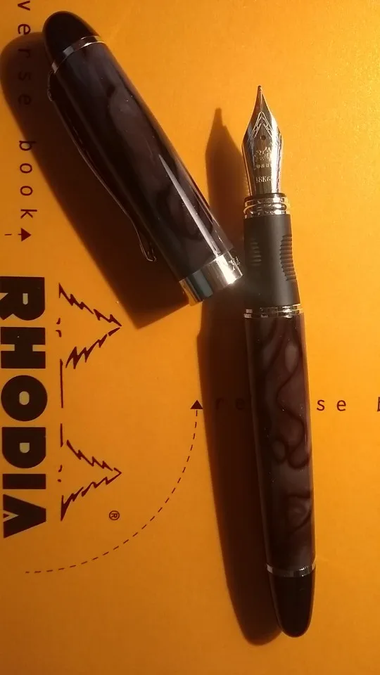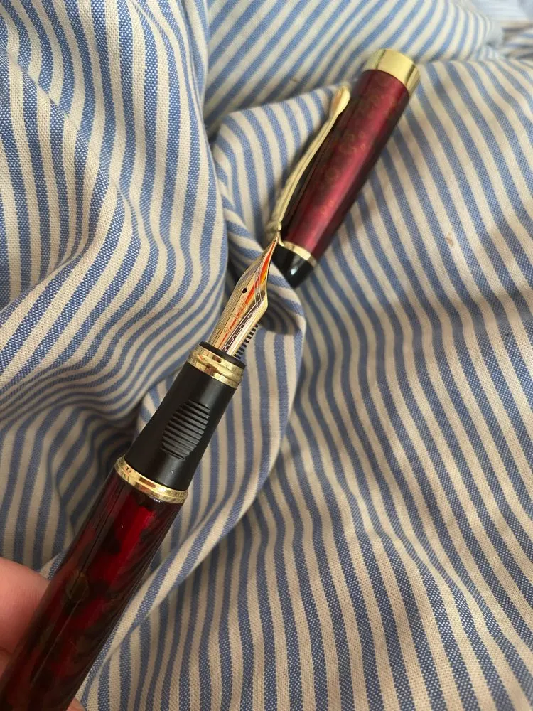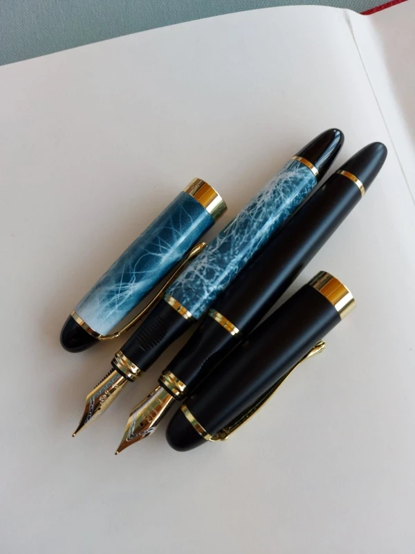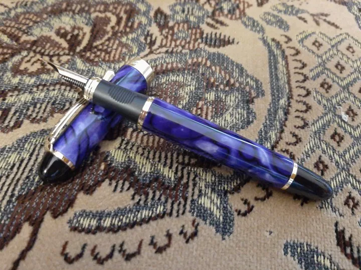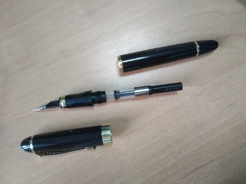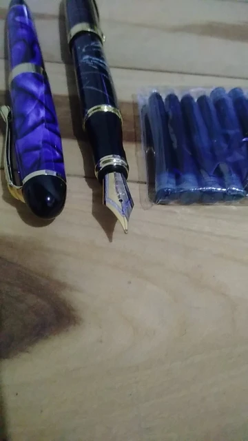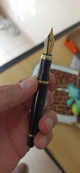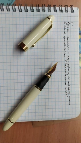 ручка красивая, перо- так себе, после всех манипуляций с обработкой горячей водой, мыльной пеной, не очень хорошо стекают чернила и длинные буквы где нужно вниз уводить палочку- как Р- или вверх как в h не прописываются- это бесит. Возможно слищком быстро пишу, а перо довольно толстое и чернила просто не успевают дойти до конца..но не факт..попробую заказать перо тоньше и проверю