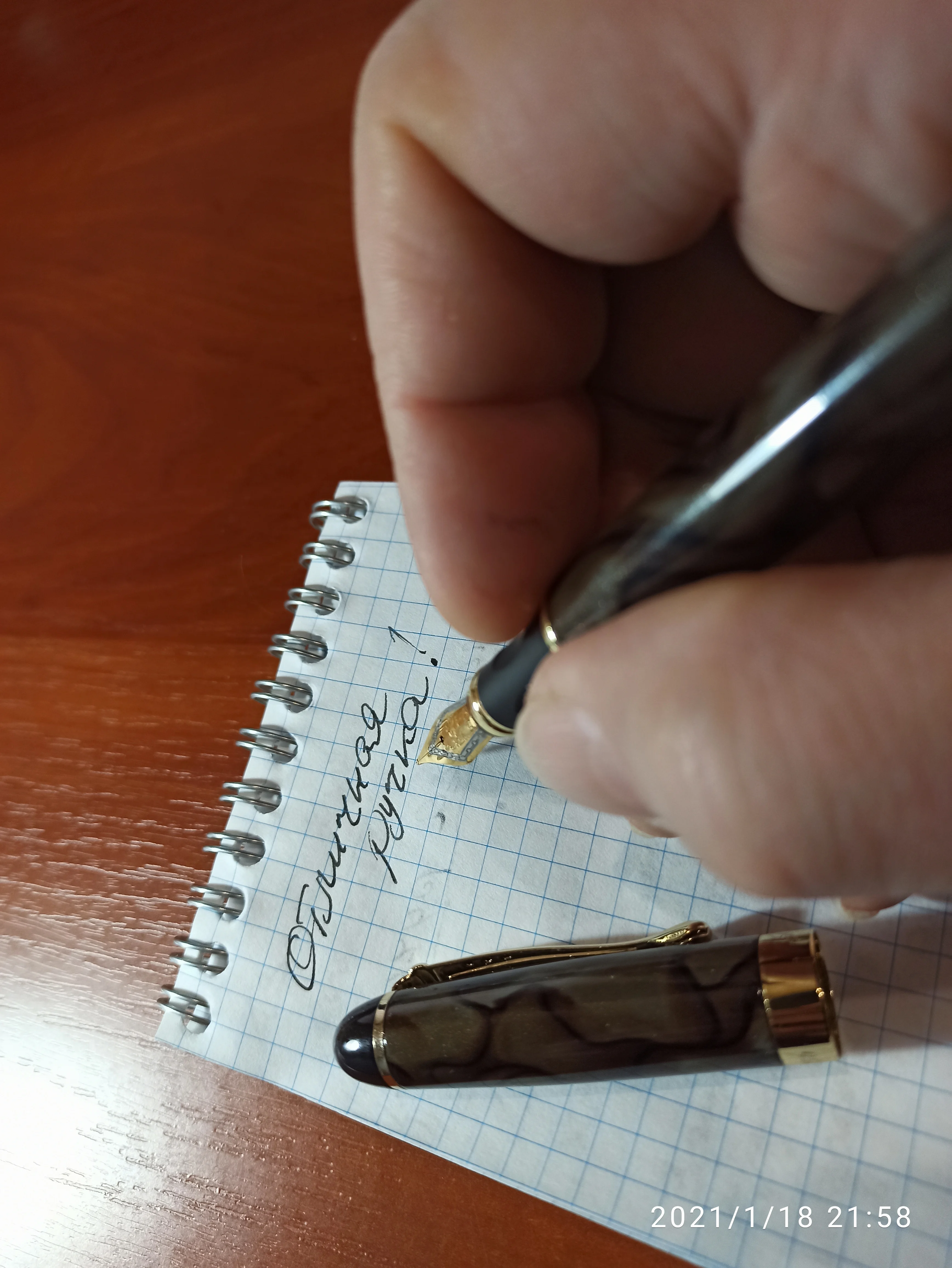 Ручка в руке приятная, достаточно тяжёлая, перо не шибко понравилось, но в целом изделие годное.