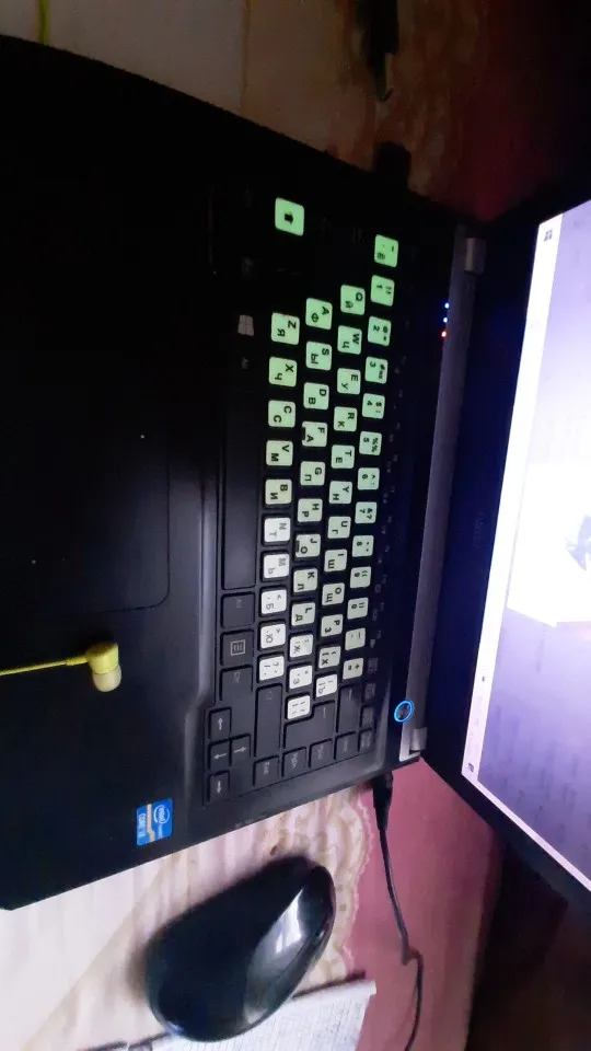 Для клавиатуры моего ноутбука маловаты оказались наклейки.светятся неплохо,если сначала хорошо подзарядить от света