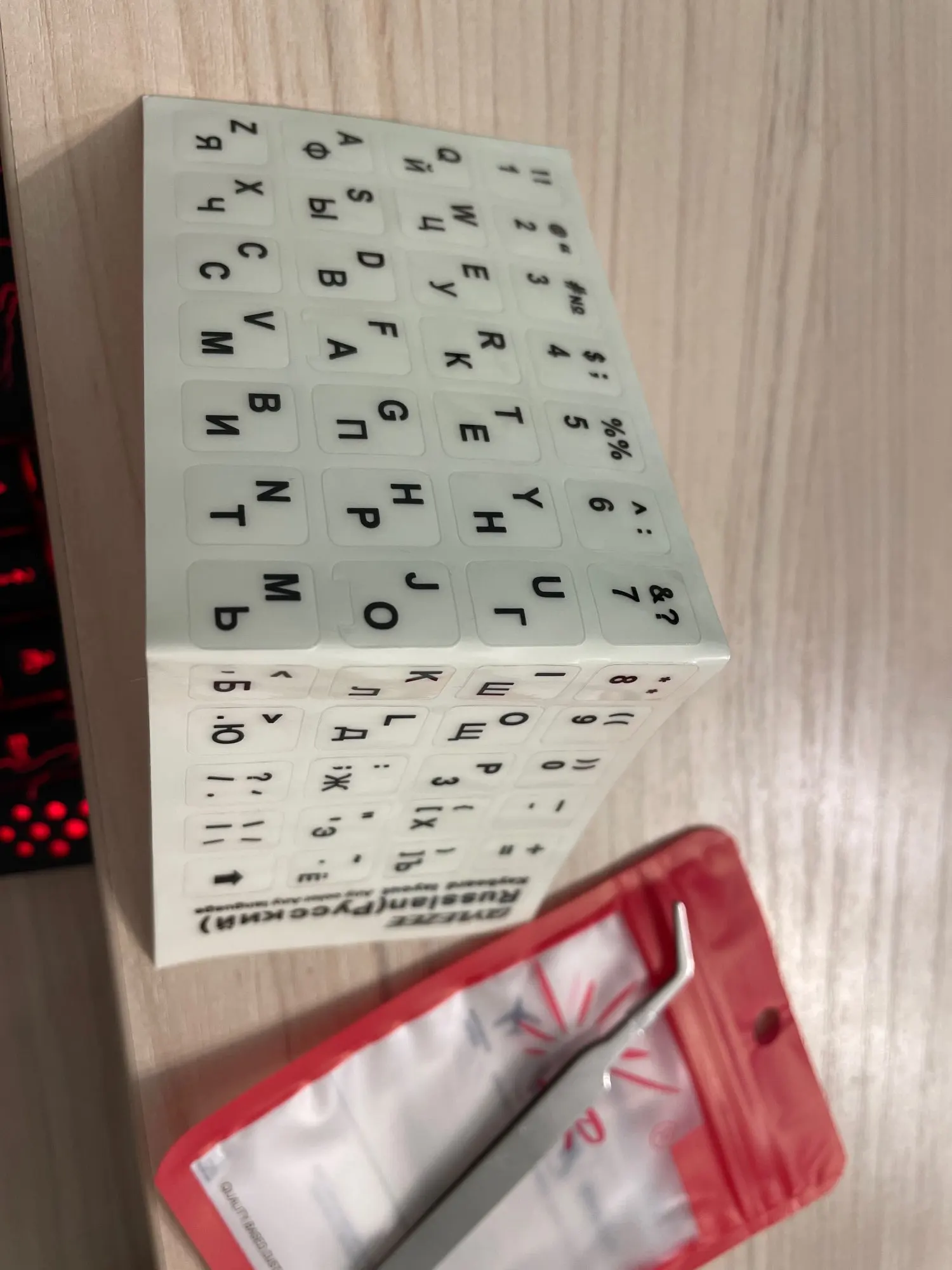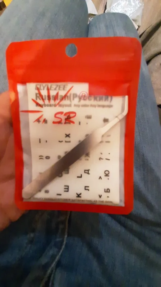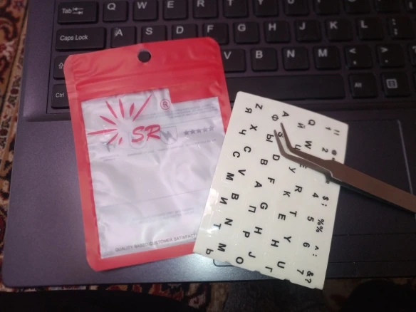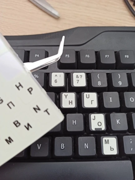 На клавишах держится хорошо, не отлипает. В свете экрана работает отлично, видны все буквы. В комплекте идет пинцет для поклейки, что очень обрадовало!
