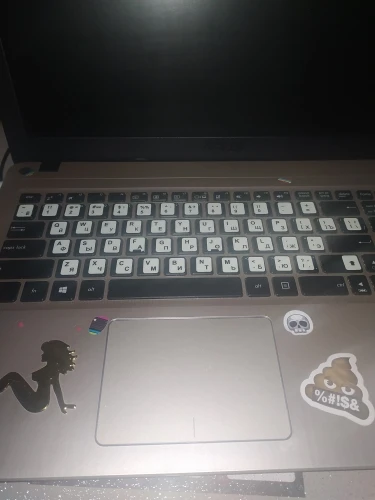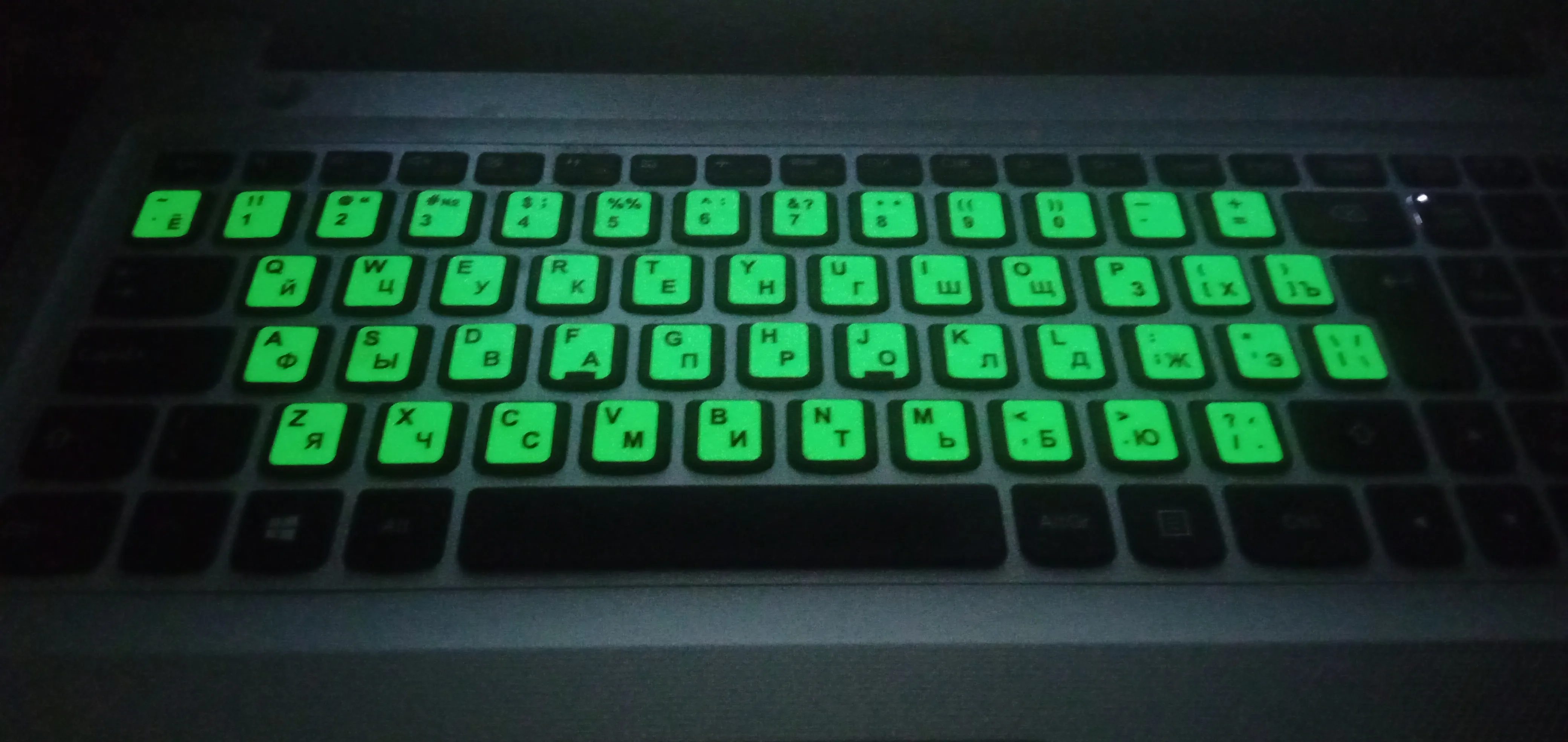 очень хорошие наклейки, подошли для моего ноутбука хорошо, размер меньше чем среднестатистические клавиши (видимо, чтобы подходило к любым), при полном отсутствии света светятся довольно ярко, если экран включен и находится менее чем под 90° наклоном к клавиатуре то становится хуже виден свет, не предусмотрены стрелки и прочие клавиши, есть лишняя светящаяся клейкая лента., в полумраке подсвечивает буквы, но не сильно. глаза не ослепляет, топовый товар