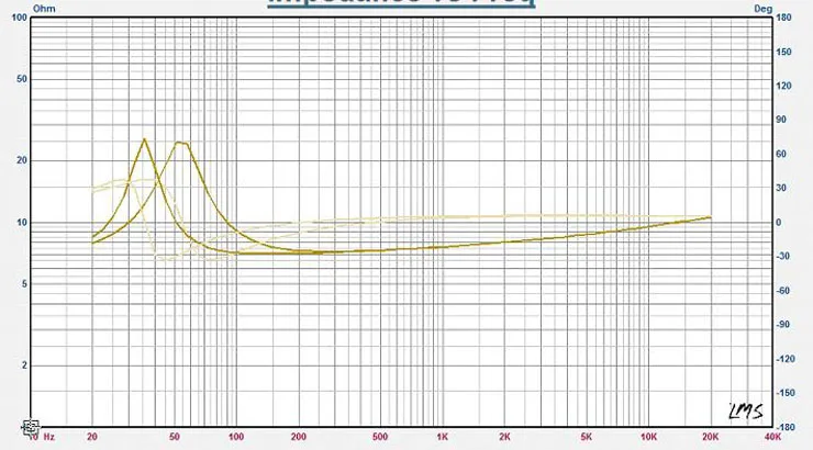 Mms = 5,056g Mmd = 3,477 m кг Kxm = 1,080 H Exm = 0,000Vas = 107,980 м? Cms = 1,978 m M/N Krm = 172,702 m Ом Erm = 0,295BL = 3,719 T Qms = 2,988 Qes = 0,832 Qts = 0,651 No = 1,599% SPLo = 94,1 дБRevc = 7,200 Ом Fo = 50,329 Гц Sd = 19,607 m M?Md = 2,800g
