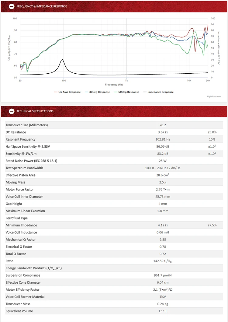 Поражен басами, сильным и динамичным. Средние частоты очень гладкие.Трудно представить, что это всего лишь 3-дюймовый динамик. По такой цене, я уверен, что это один из лучших 3-дюймовых полнодиапазонных динамиков в мире!