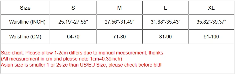 S М L XL Талия (дюймы) 25,19 "-27,55" 27,56 "-31,49" 31,88 "-35,43" 35,82 "-39,37" Талия (см) 64-70 71-80 81-90 91-100 Таблица размеров: возможны отклонения в 1-2 см из-за ручного измерения, спасибо (Все измерения в см, обратите внимание: 1 см = 0,39 дюйма) Азиатский размер меньше на 1 или 2 размера, чем размер США/ЕС, пожалуйста, проверьте перед покупкой!