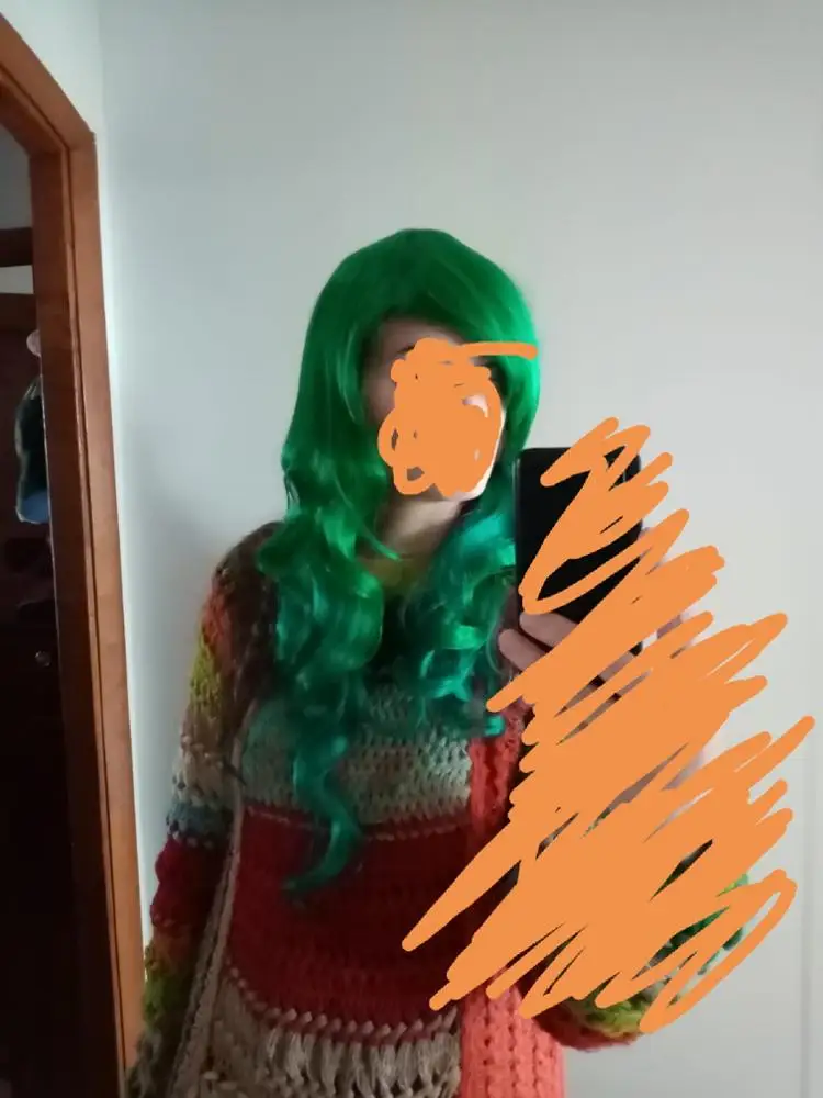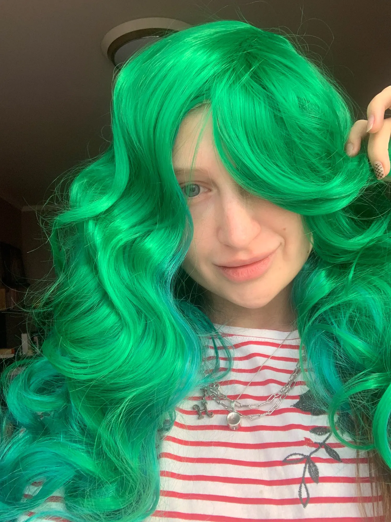 Парик качественный, длинный, примерно 60 см. По цвету зелёные только верхние пряди, основной цвет - бирюза. Кудряшки аккуратные. Странно лежит челка, но думаю ее можно как то заколоть