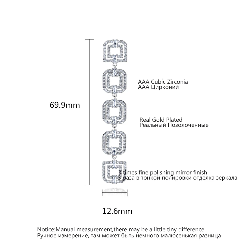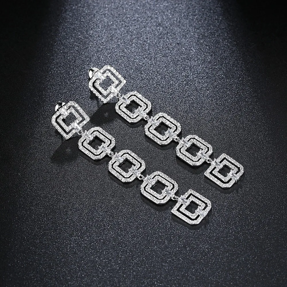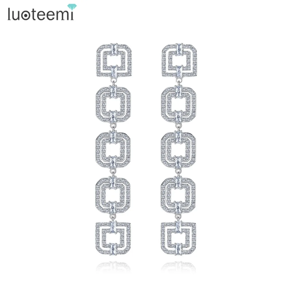 Luoteemi элегантный ветер пять двойные квадраты Connection Long Висячие серьги ясно, кубический циркон атмосфера моды Стиль леди ювелирные изделия